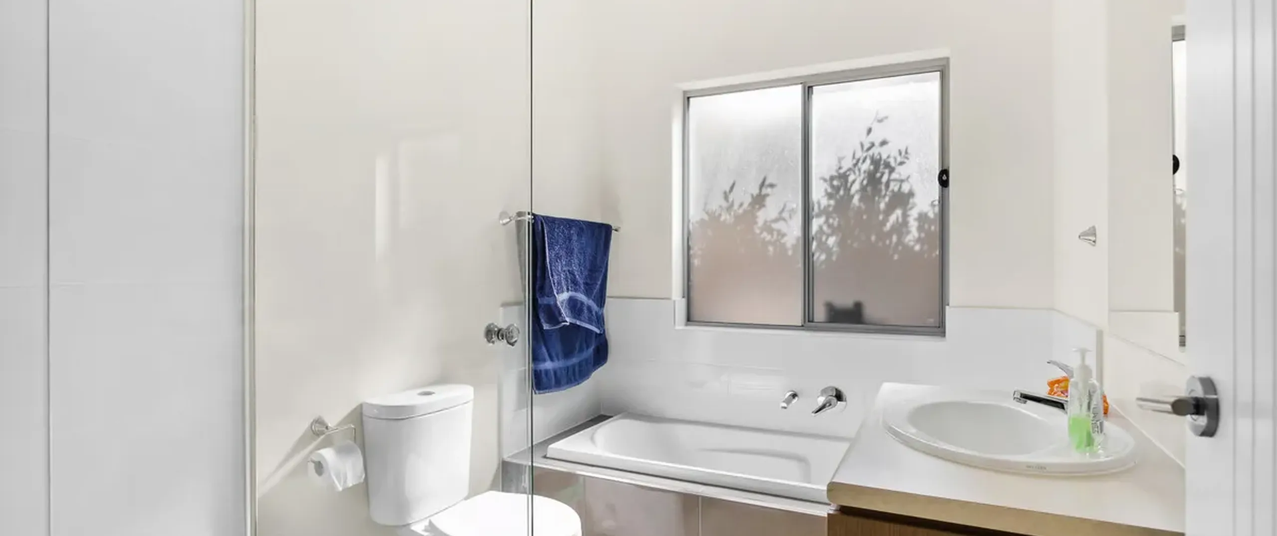 - Central main bathroom with separate bath and shower