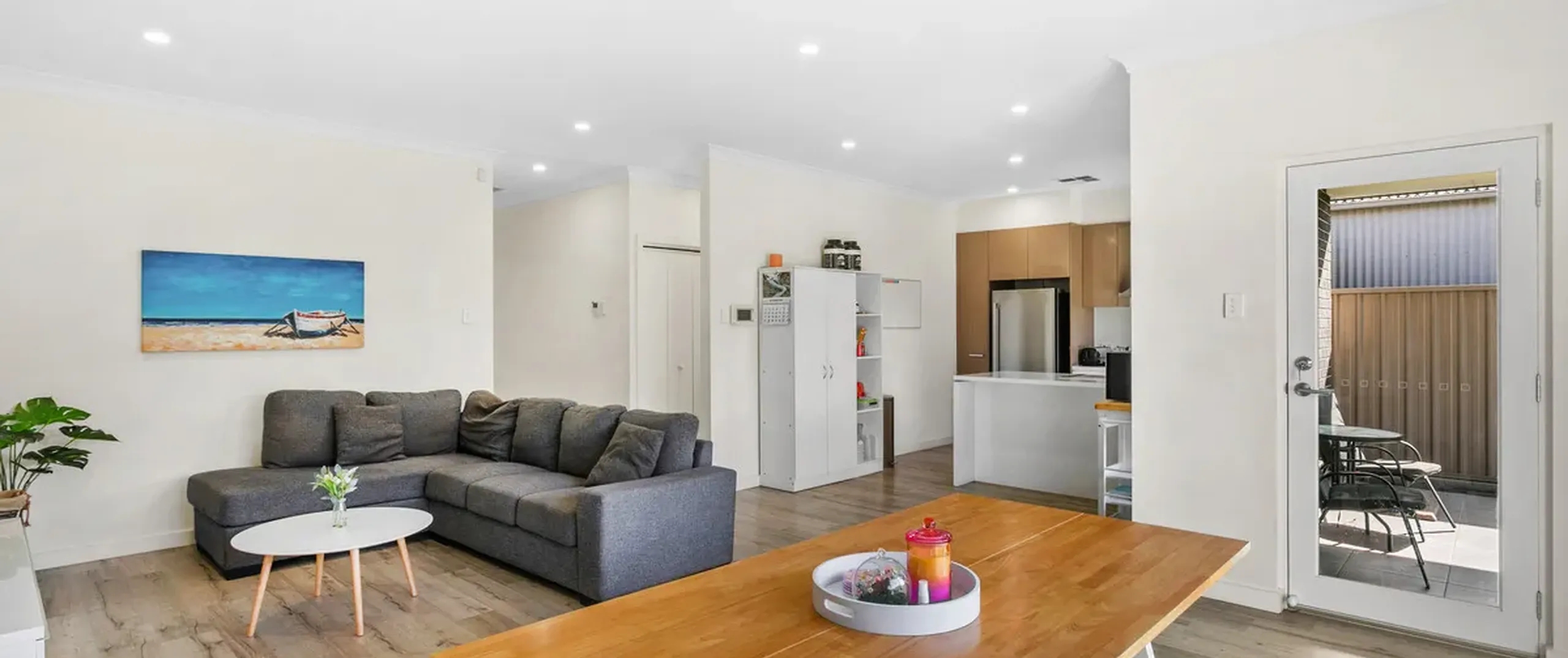 - Light filled family and dining area featuring downlights and easy-care flooring with a door leading to the entertaining area plus glass sliding doors to the grass area