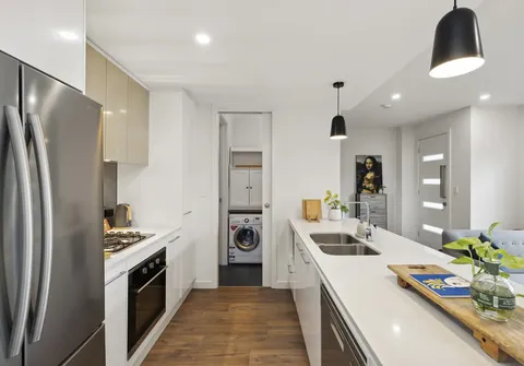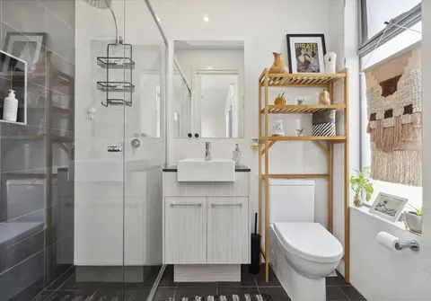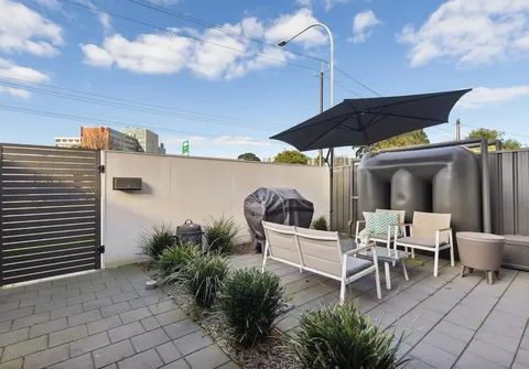 The ground floor houses the open plan living and meals area flooded with natural light and seamless access via glass sliding doors to the private paved front courtyard. The contemporary finishes continue into the timeless kitchen with quality stainless steel appliances, island bench offering a breakfast bar for the avid foodie, and ample storage space. Completing the layout is a practical laundry with an additional toilet for added convenience.