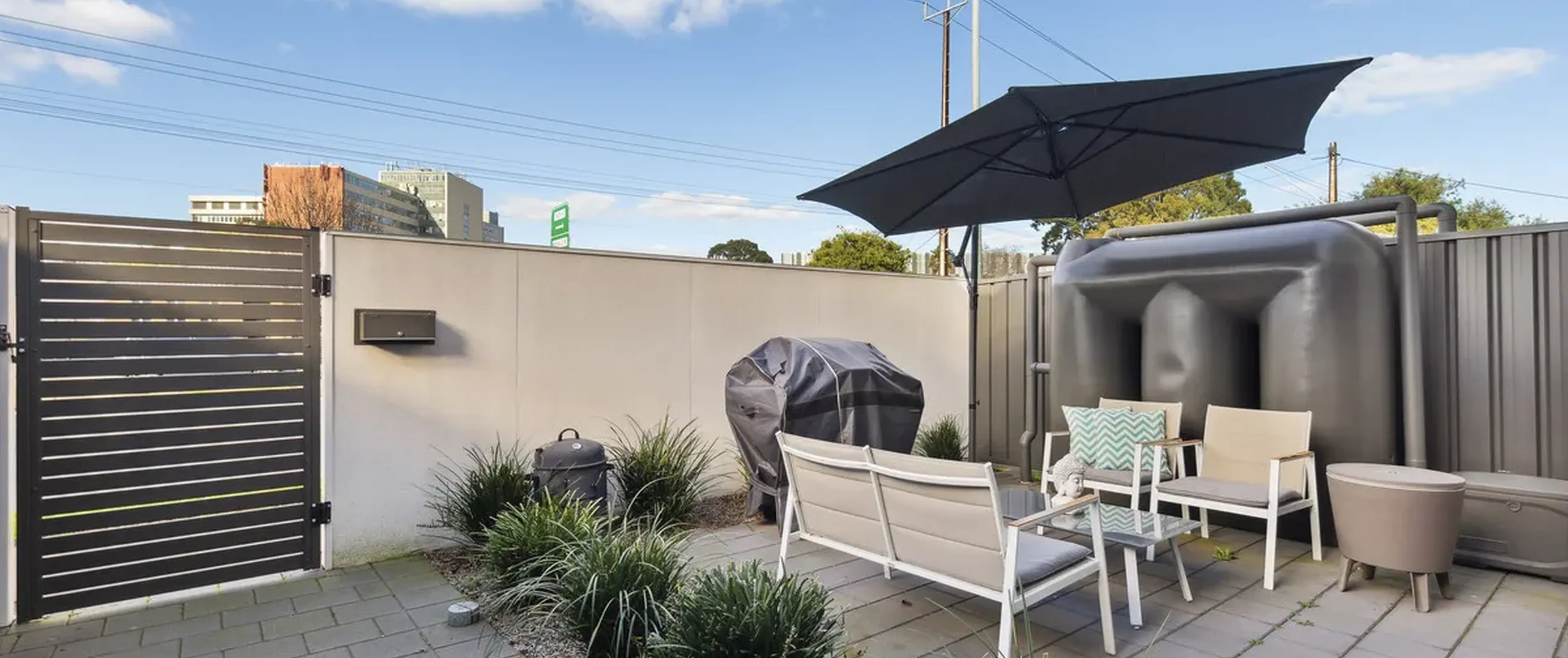 - Spacious paved courtyard with neat garden beds and rainwater tank