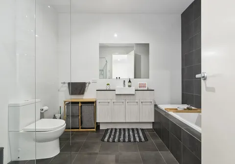 Upstairs, two good sized guest bedrooms await with easy-access to the on-trend main bathroom. The spacious master bedroom accommodates an ensuite, built-in robe, and your very own private balcony to enjoy the fresh morning air. The additional lounge area can be utilised as a retreat or study area perfect for anyone working from home. The secure garage offers parking space for two vehicles with automatic panel lift door and additional storage space.
