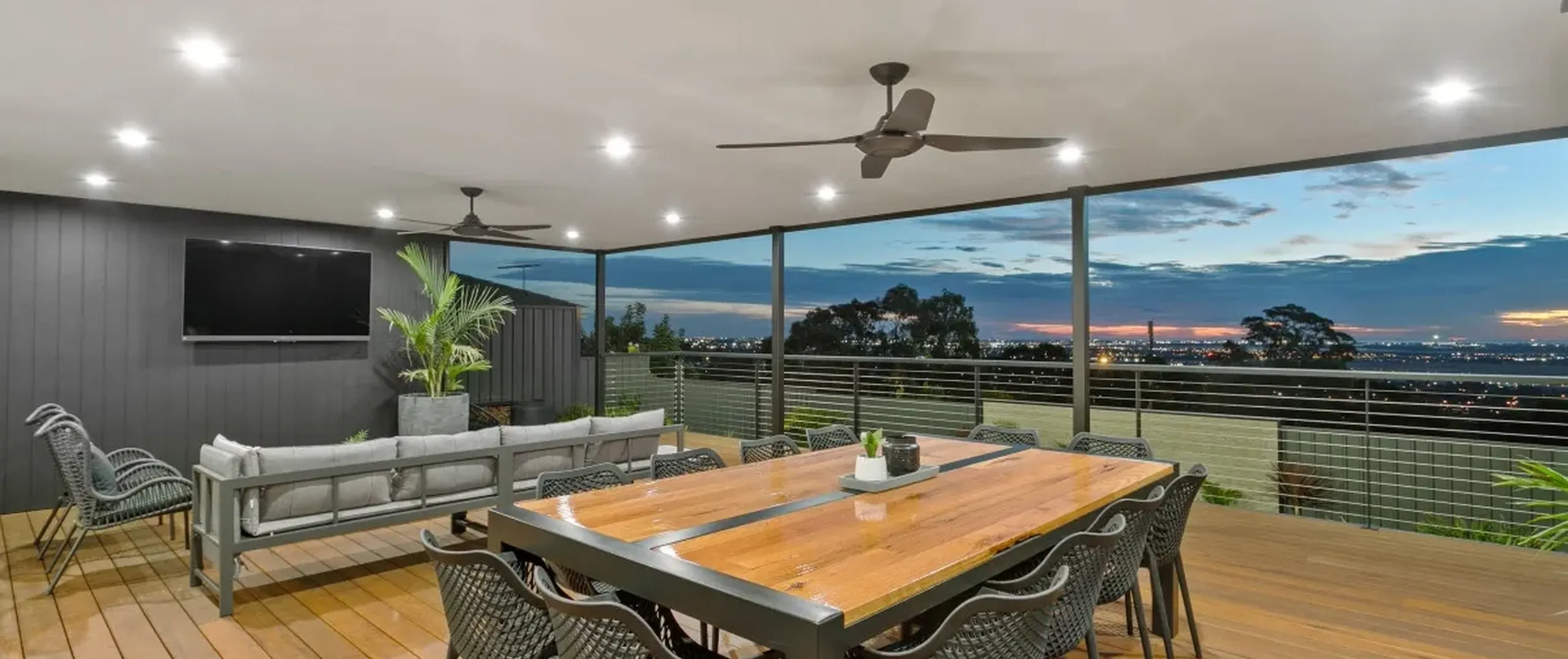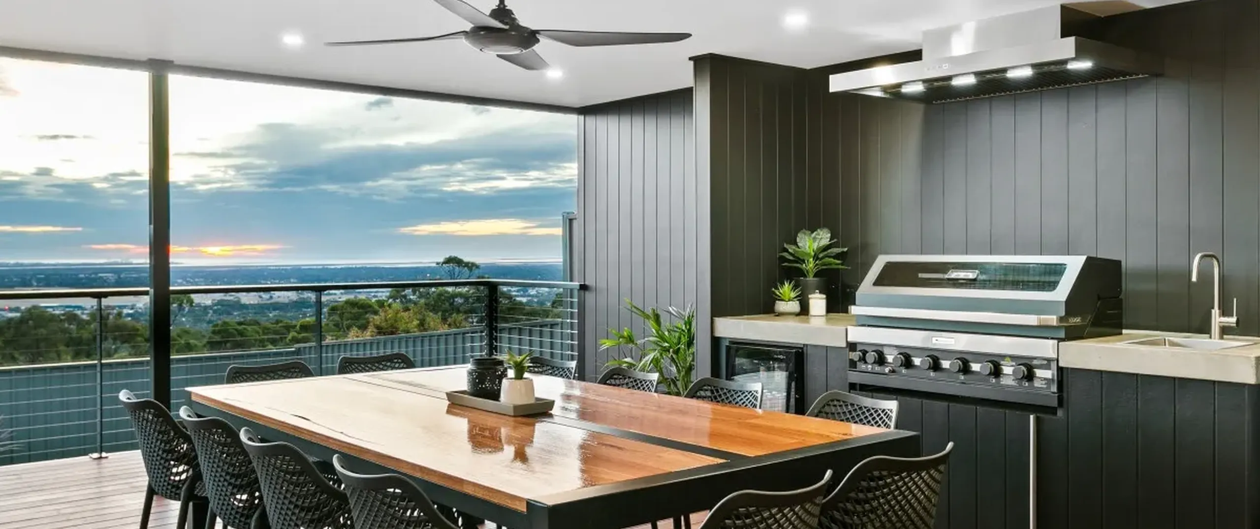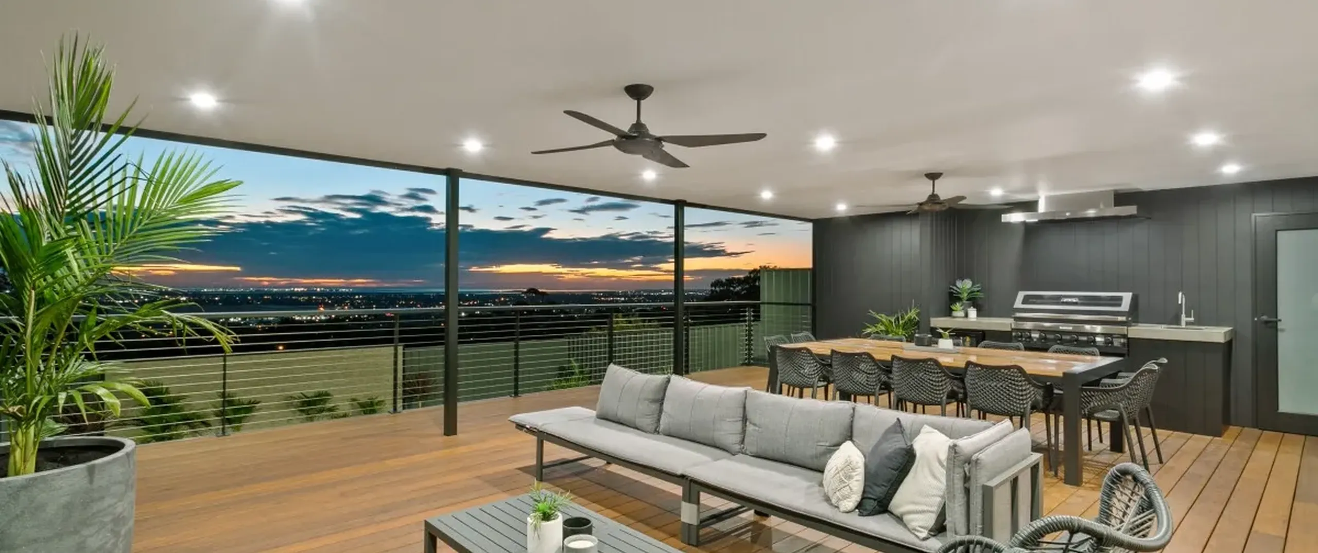- Exceptional decked, outdoor entertaining alfresco area complete with ceiling fans, ample lighting and built-in BBQ with sink, range hood & bar fridge