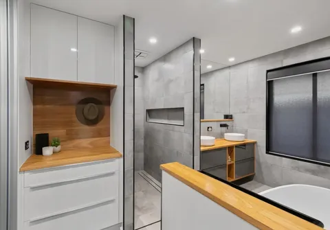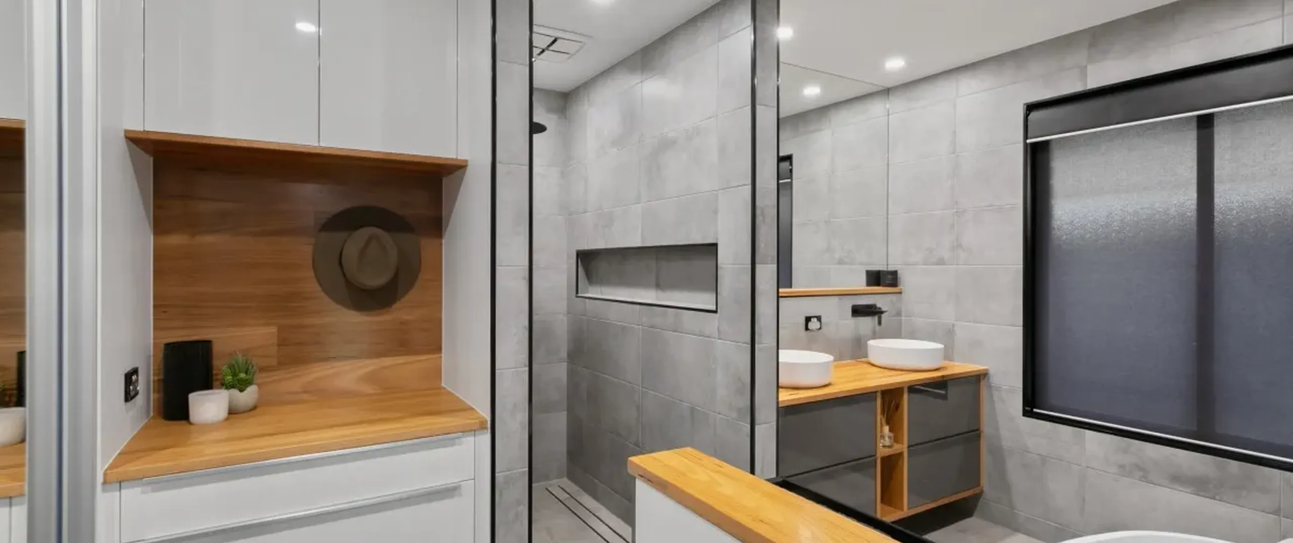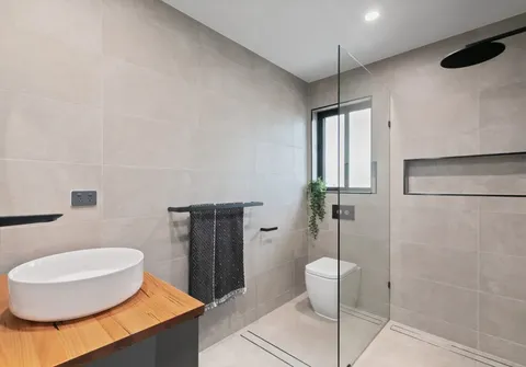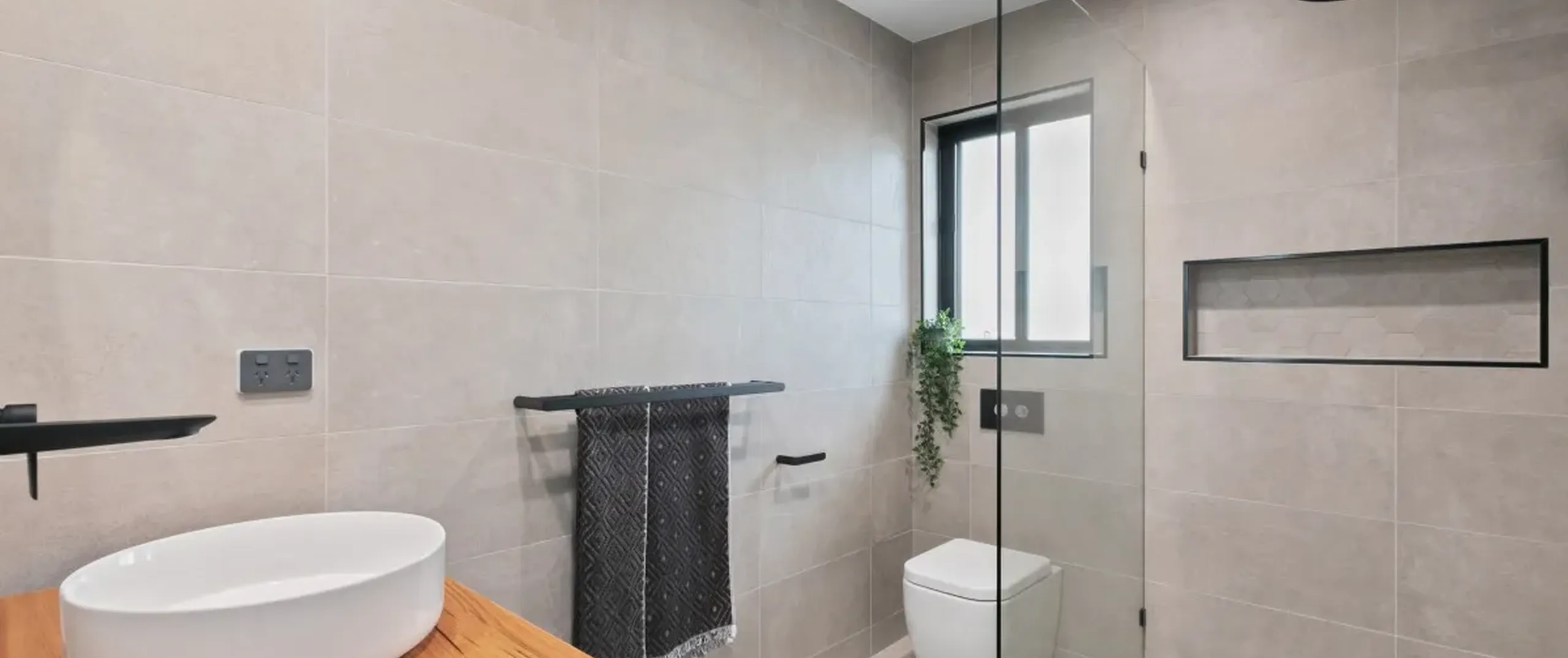 - Stylish main bathroom boasting floor to ceiling tiles, above counter wash basin, soft touch draws, shower with niche and stylish matte black tapware