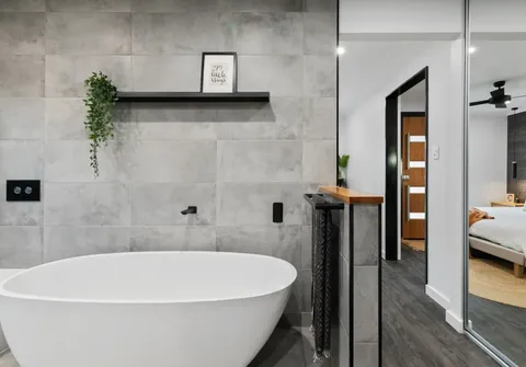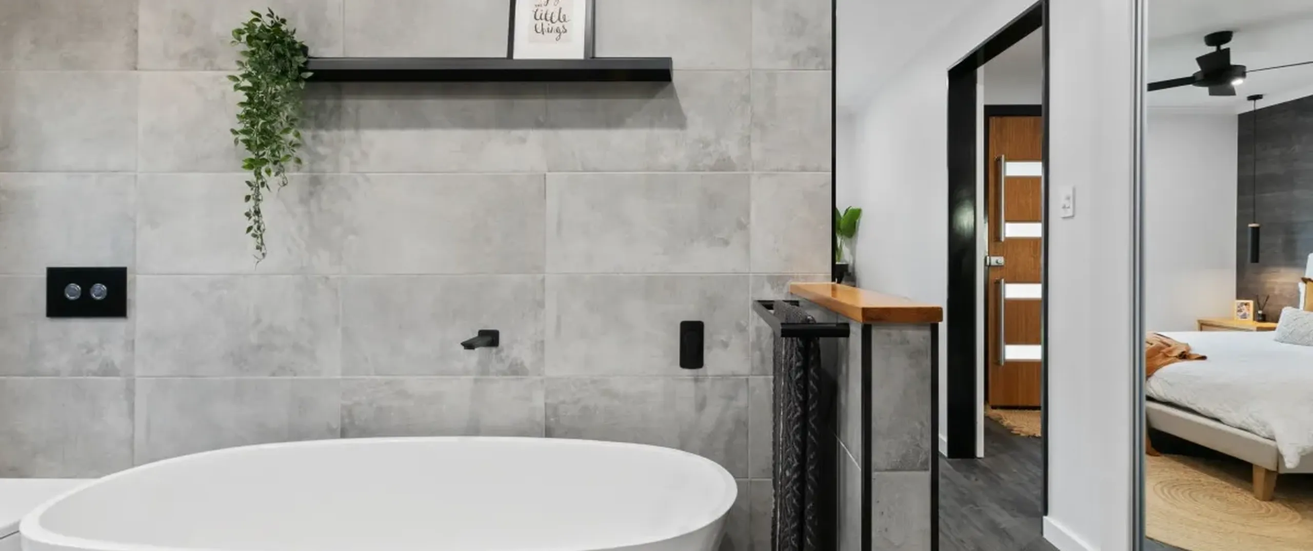 - Spacious master bedroom complete with built-in robe, ceiling fan and large stylish ensuite boasting floor to ceiling tiles, freestanding bathtub, dual above counter wash basins, double shower with niche, complimented by stylish matte black tapware