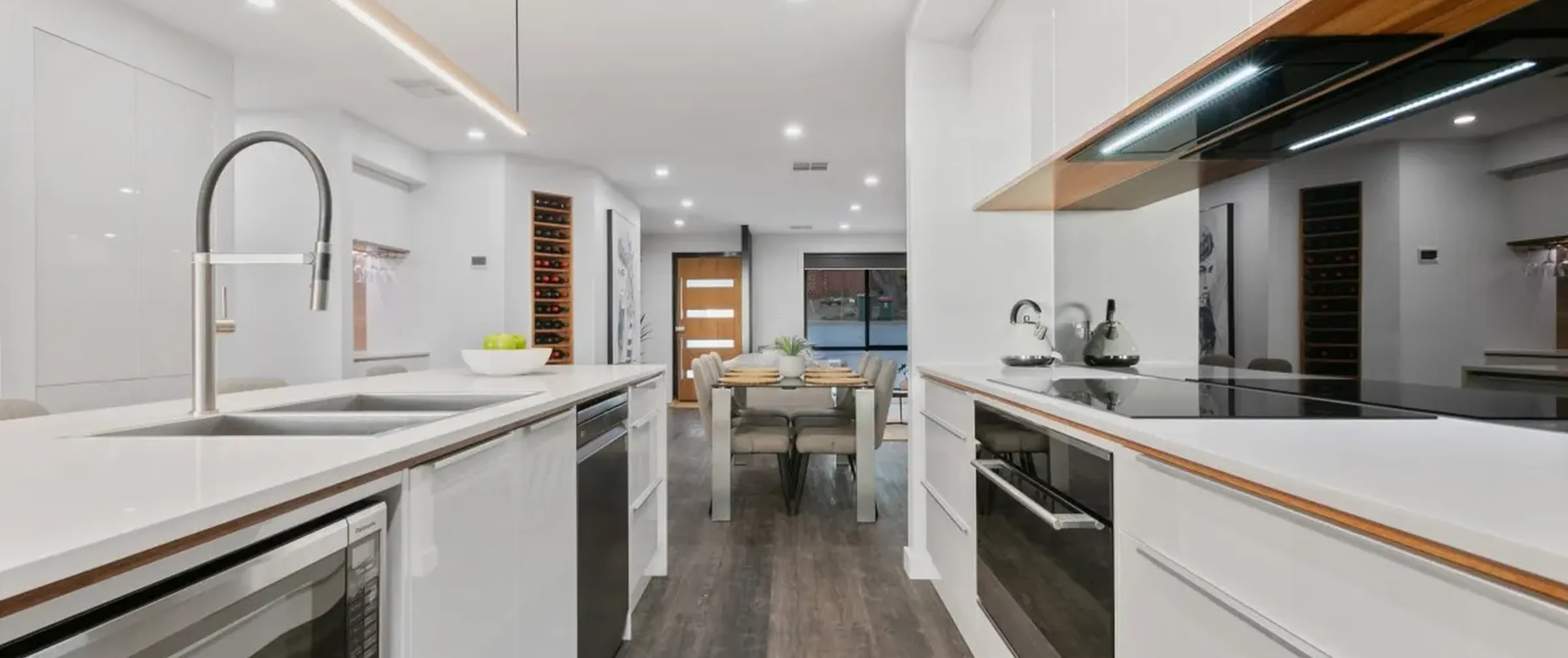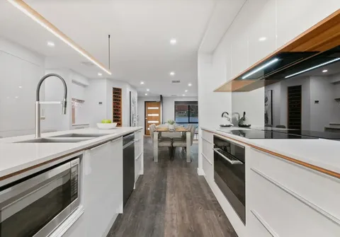- Sleek white kitchen with charming wood accents, stainless appliances, dishwasher, 900 induction cook top and breakfast bar