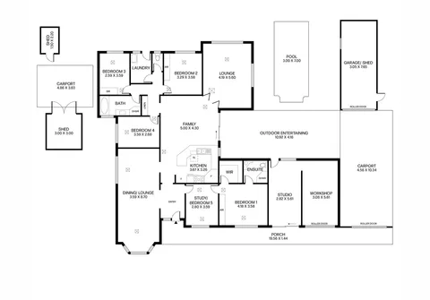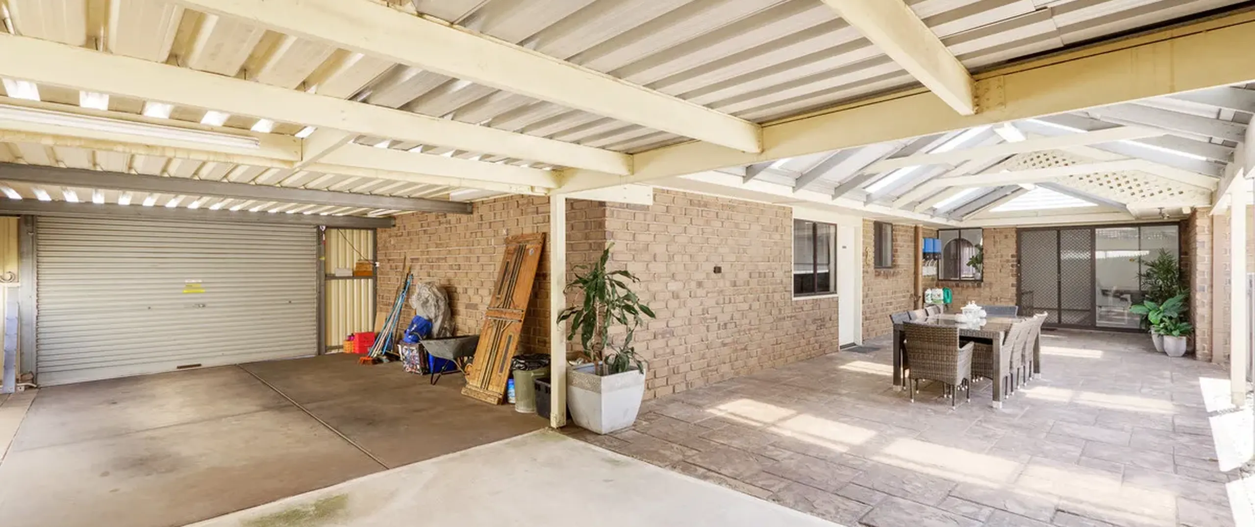 - Double-length carport with roller door and drive-through access to the large garden shed
