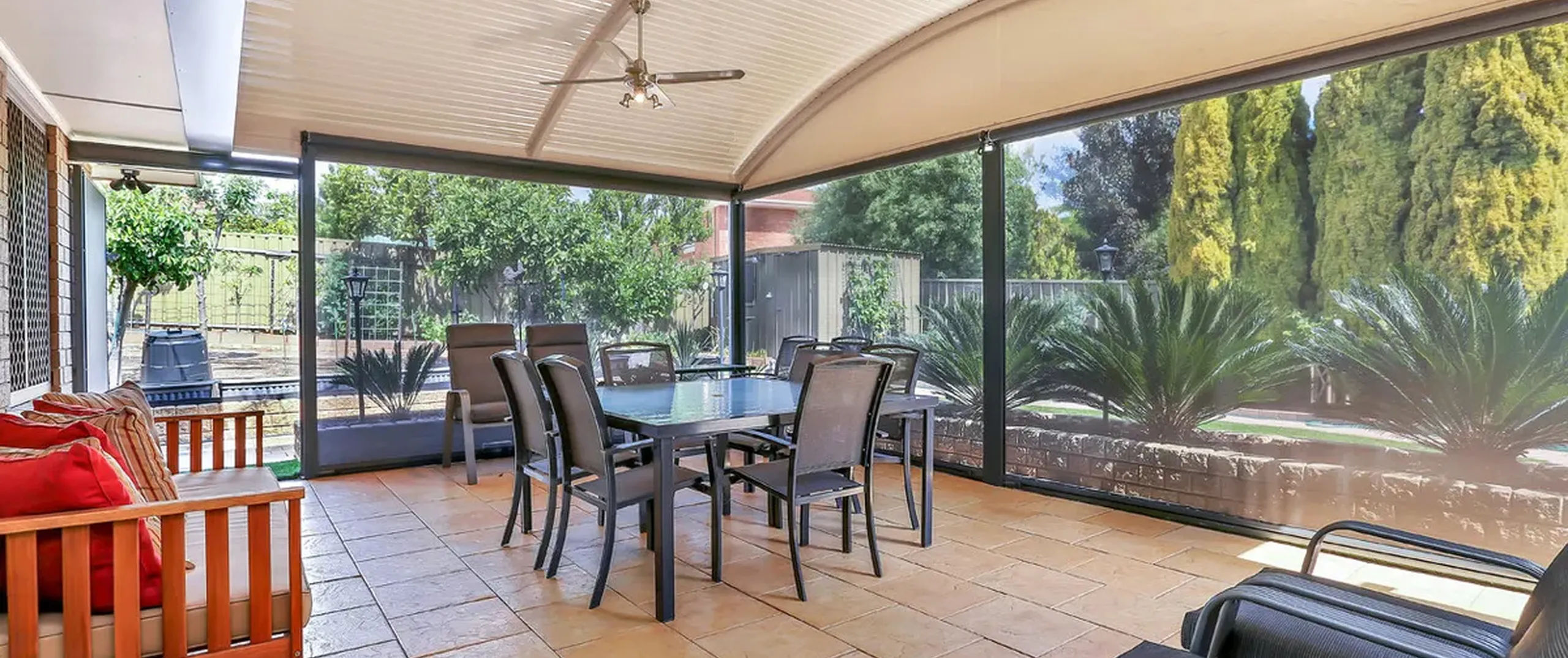 - Expansive undercover outdoor entertaining area with ceiling fan and café blinds