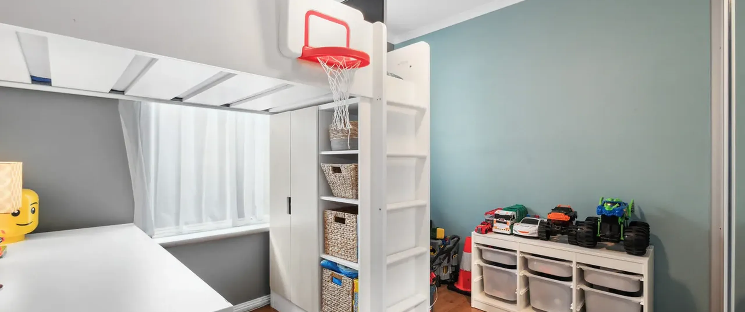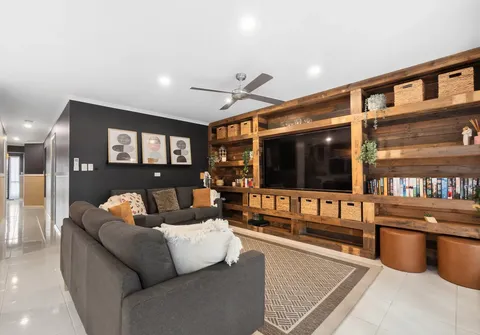 - Warm and inviting living area complete with built-in feature bookcase shelving, split system air-conditioning and ceiling fan
