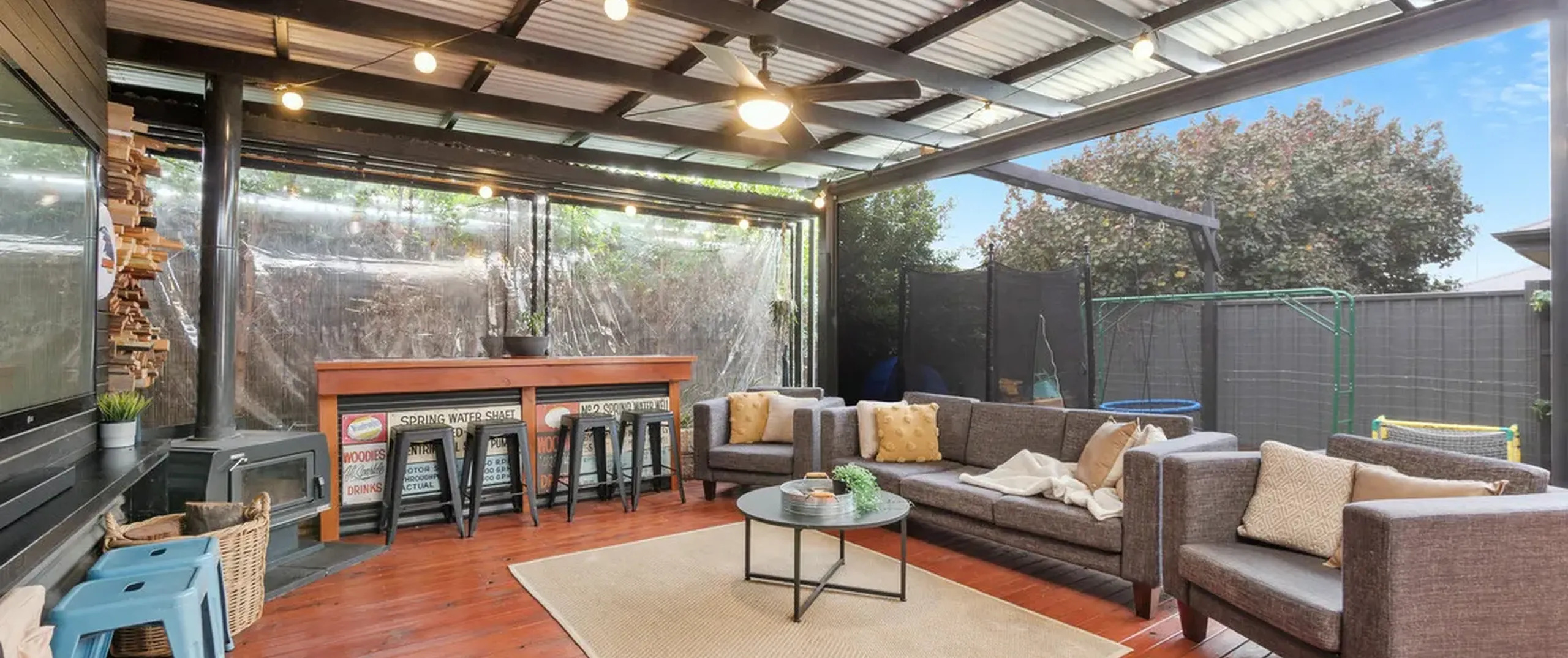 - Impressive, decked undercover outdoor entertaining area with pergola, ceiling fan and outdoor weather blinds
