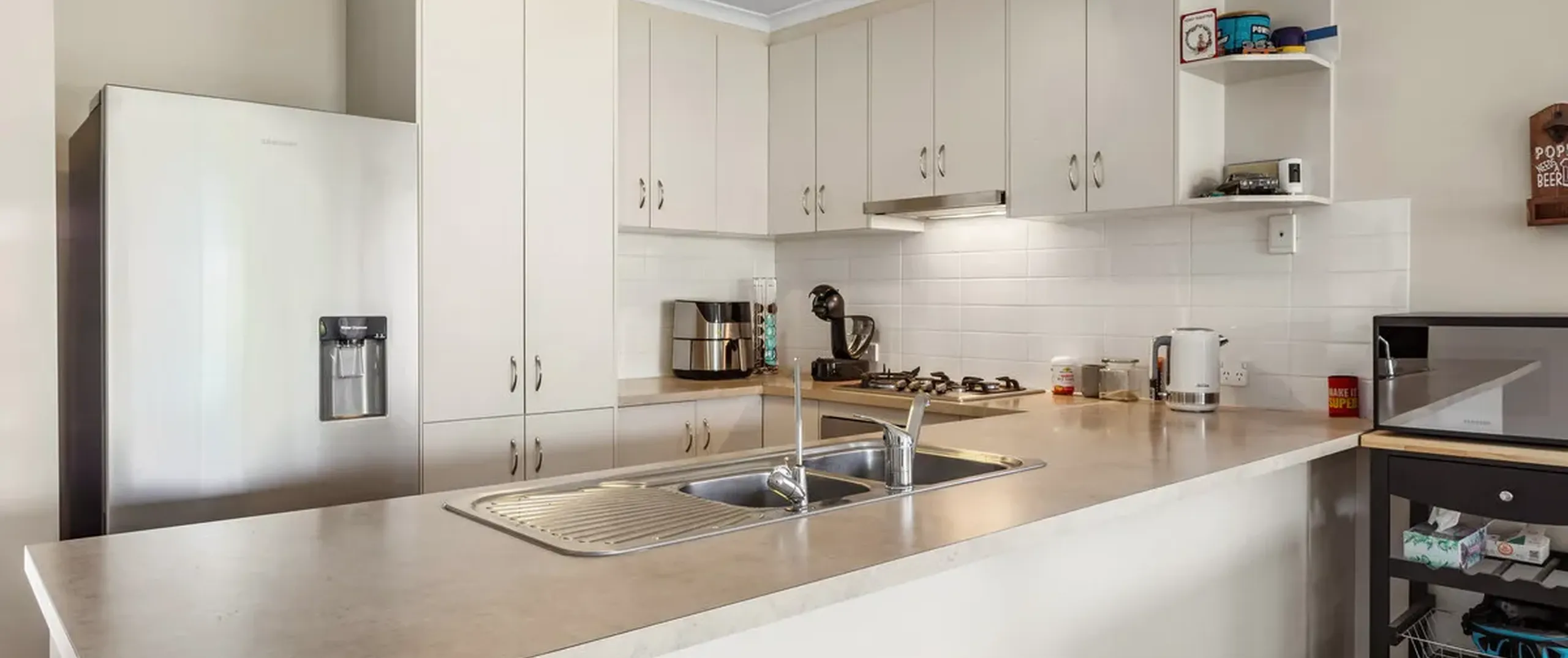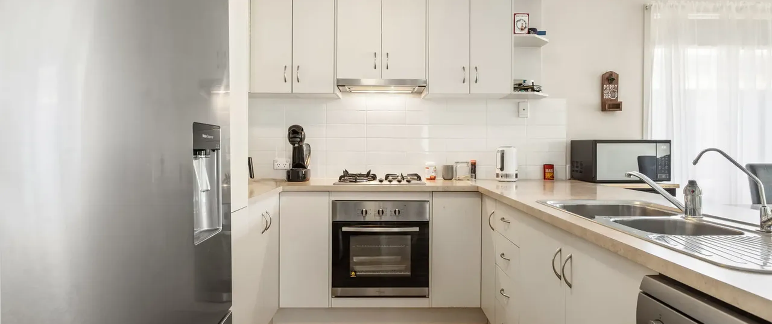 - Timeless kitchen with stainless steel appliances, dishwasher, gas cooktop and breakfast bar