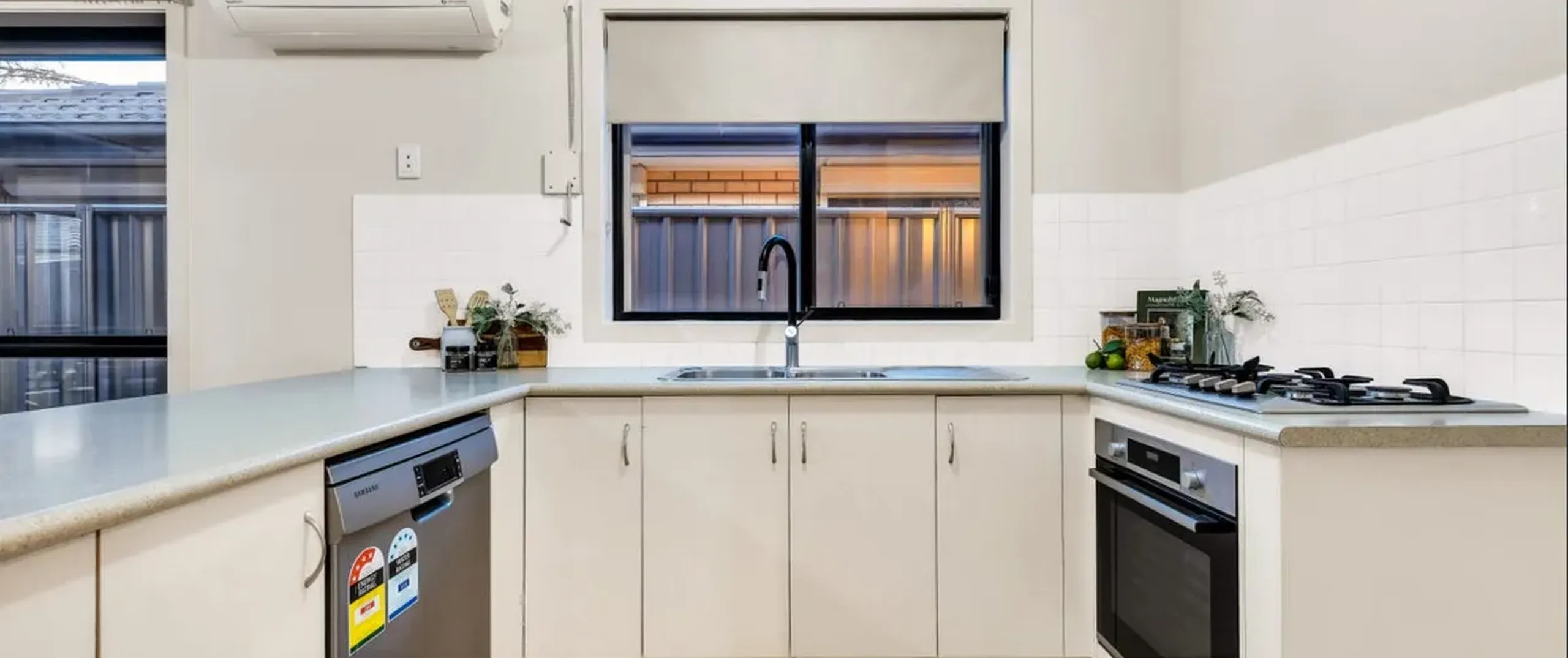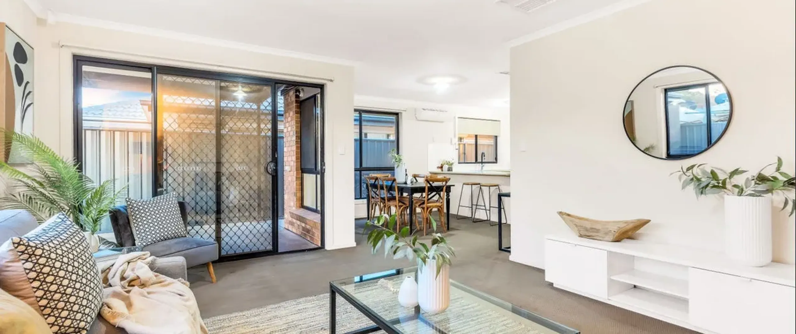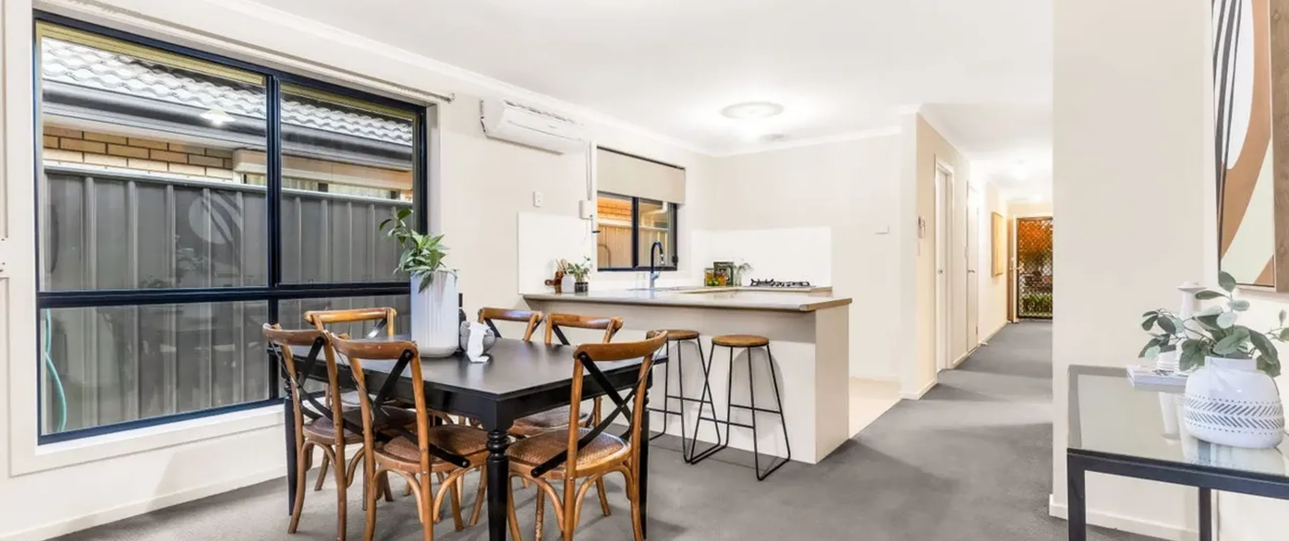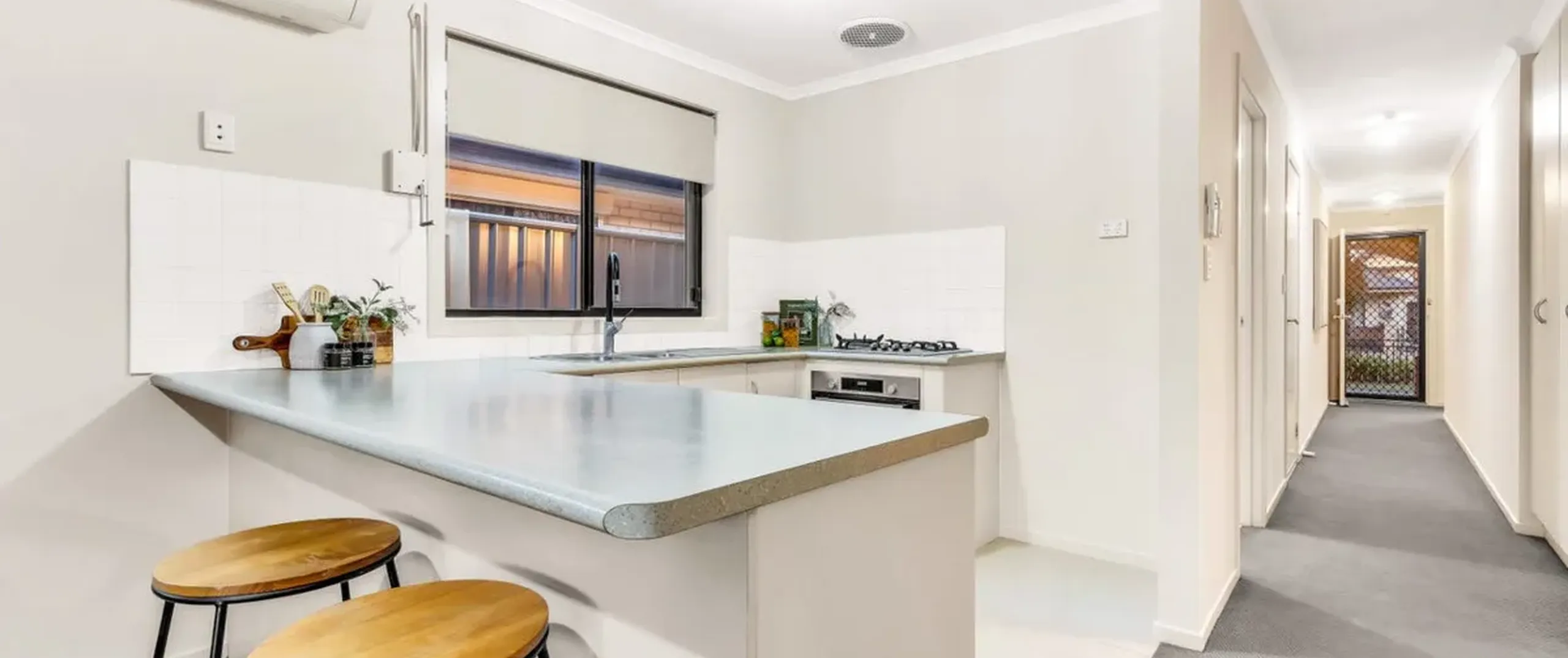 - Light filled, open plan kitchen, living and dining area with carpet and sliding door to the backyard