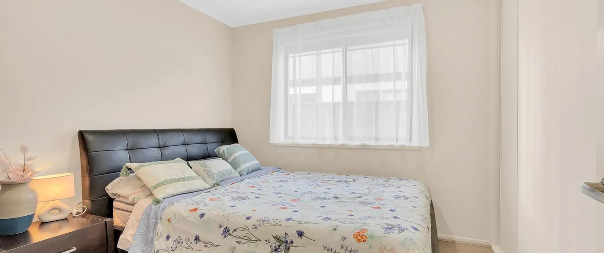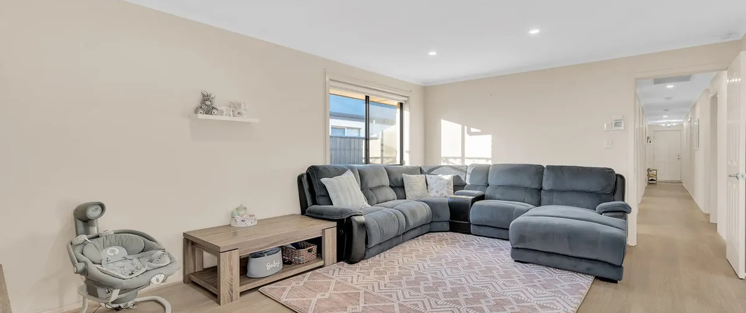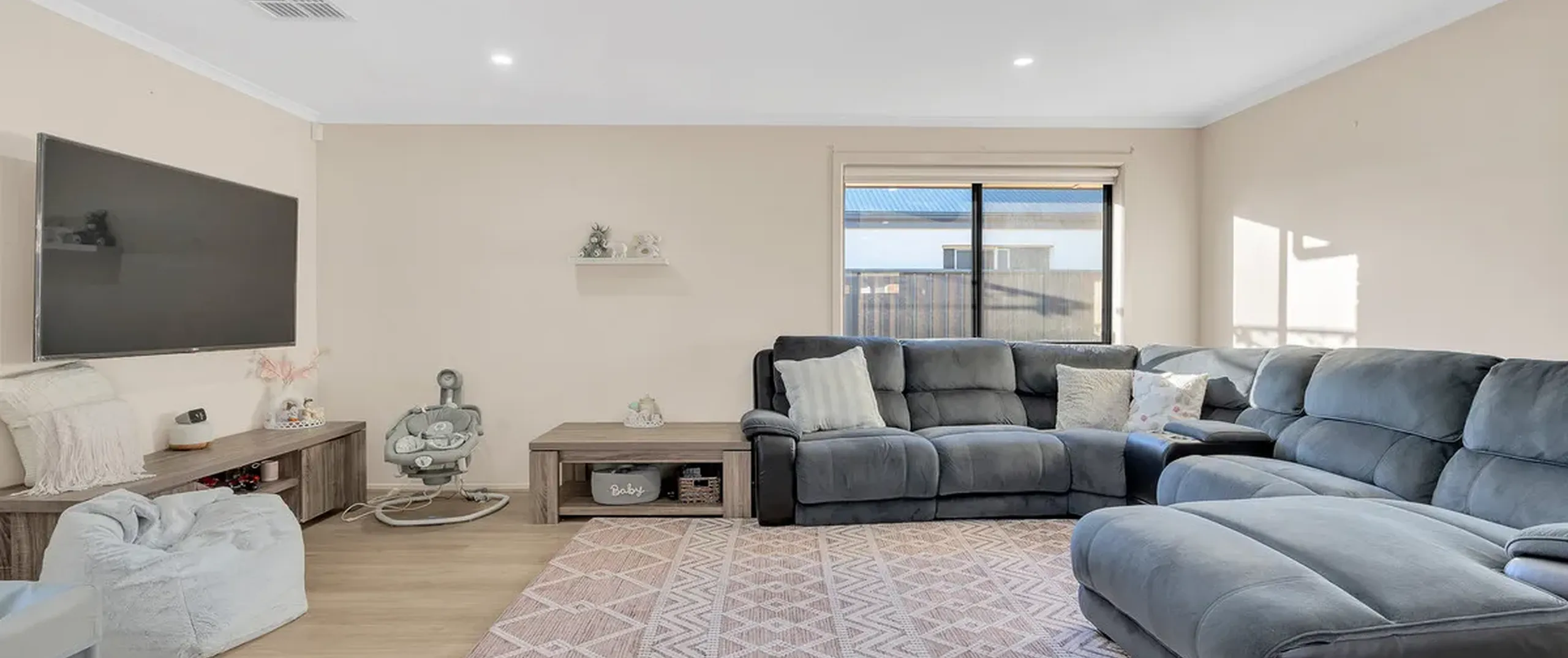 - Light-filled living area with glass sliding door leading out to the patio area
