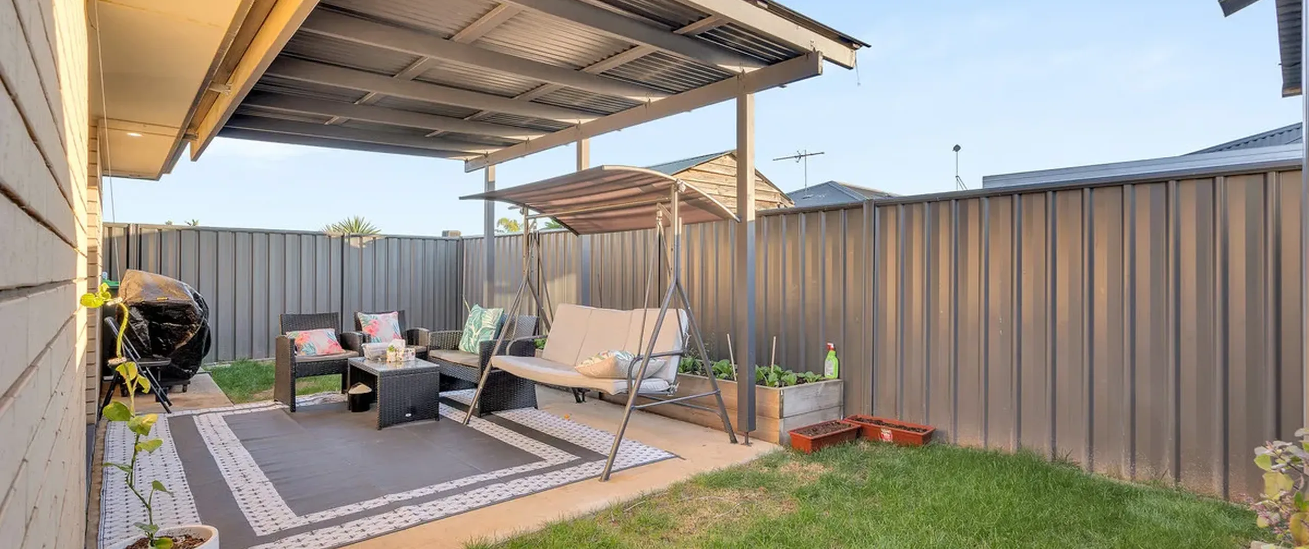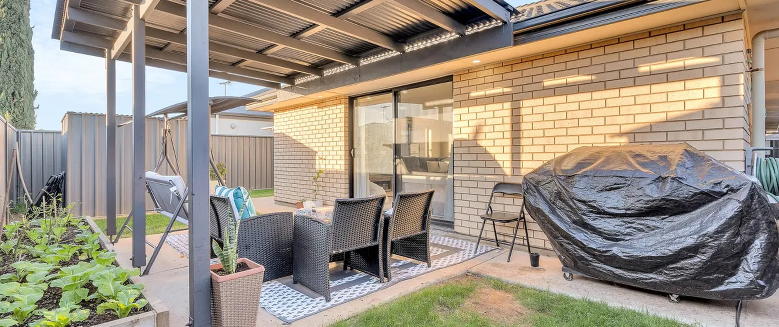 - Securely fenced backyard with a pergola, perfect for entertaining