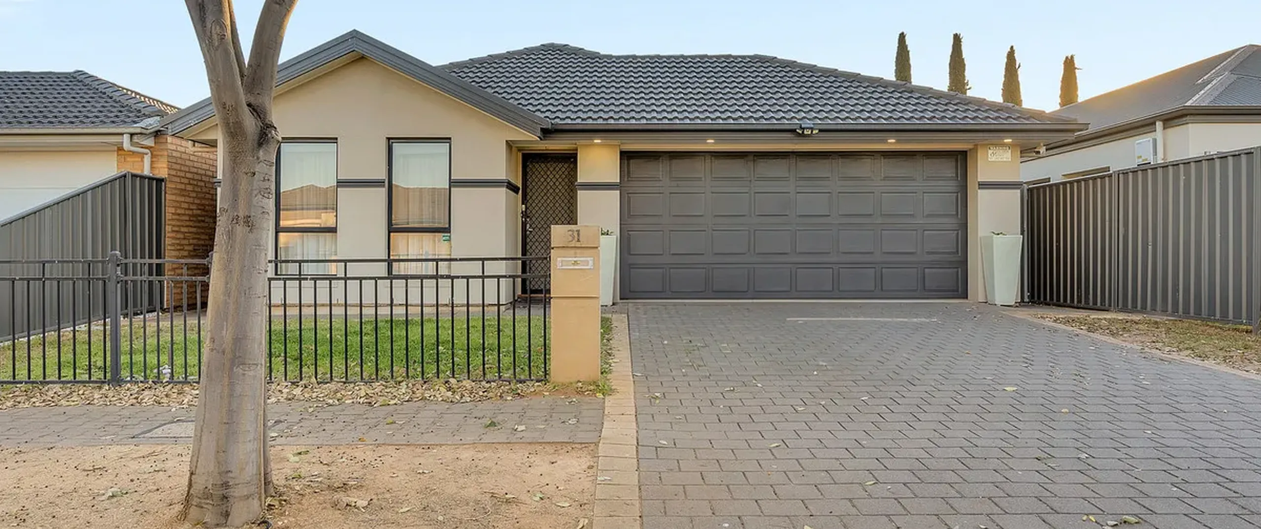 - Double garage under the main roof with an automatic panel lift door
