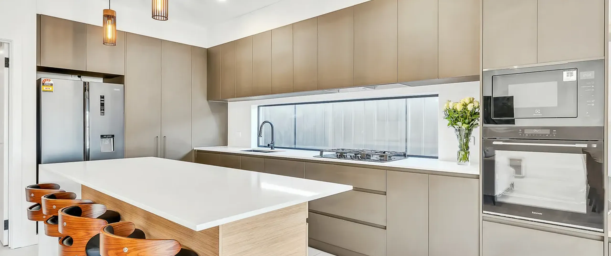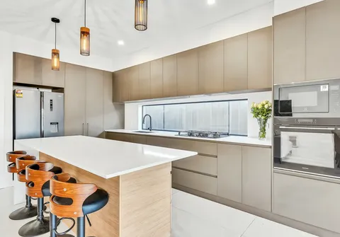 - Contemporary bright tiled kitchen boasting stainless steel appliances including gas cooktop, integrated dishwasher, oven, island breakfast bar and ample cupboard and bench space