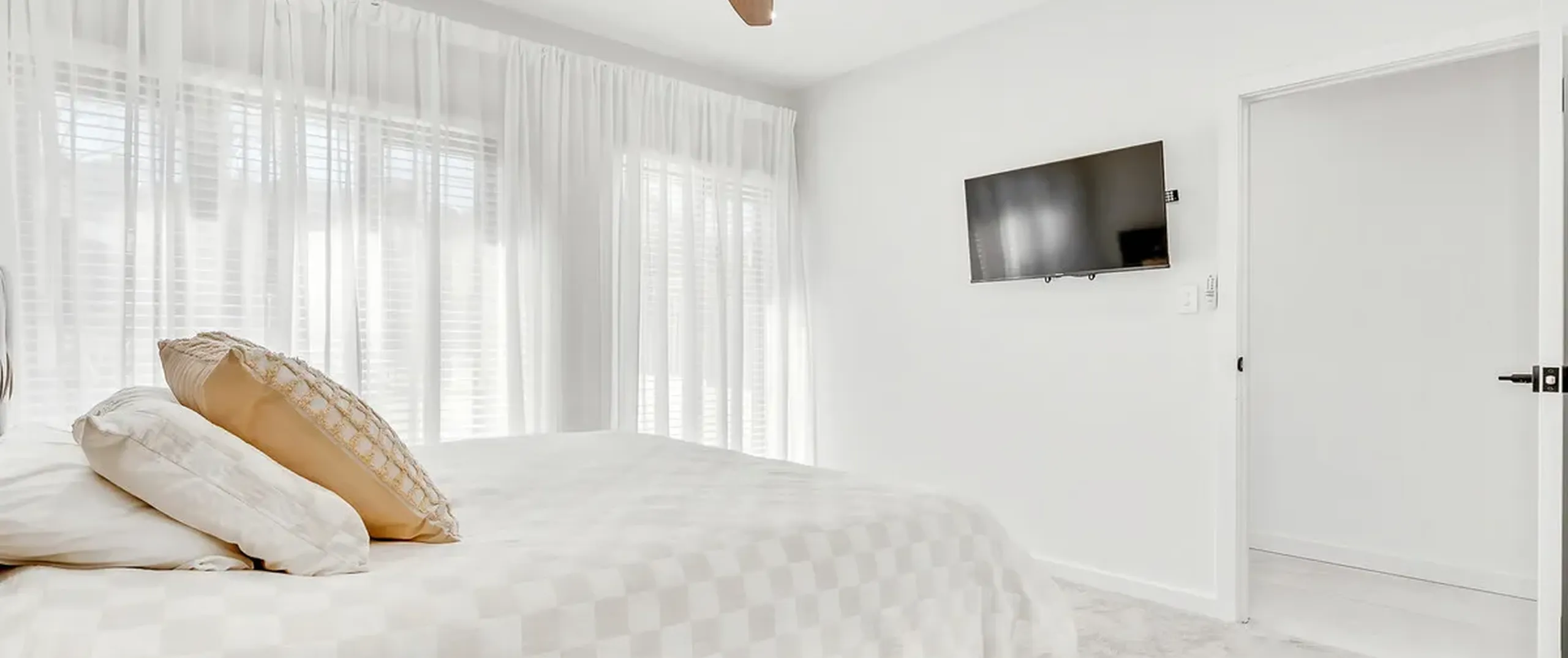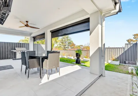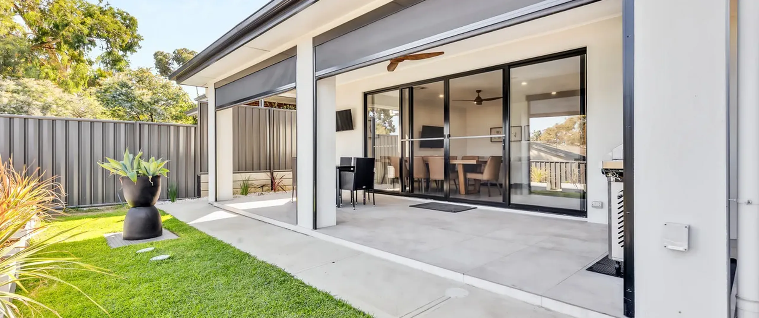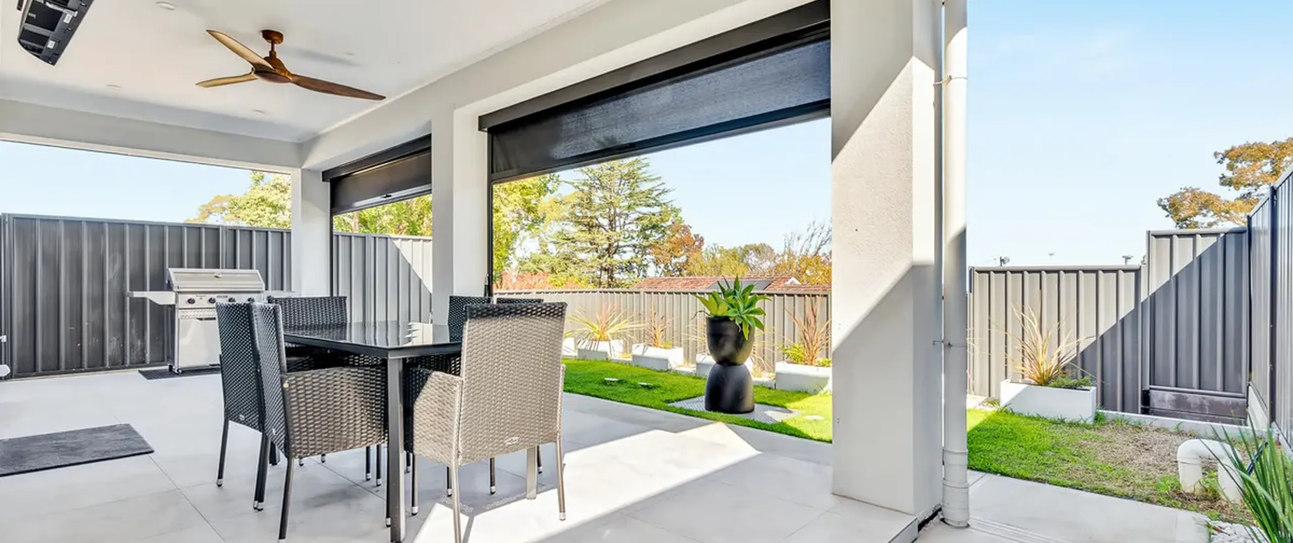 - Outdoor covered entertaining area with manual pull down block out blinds, ceiling fan and TV mounted on wall