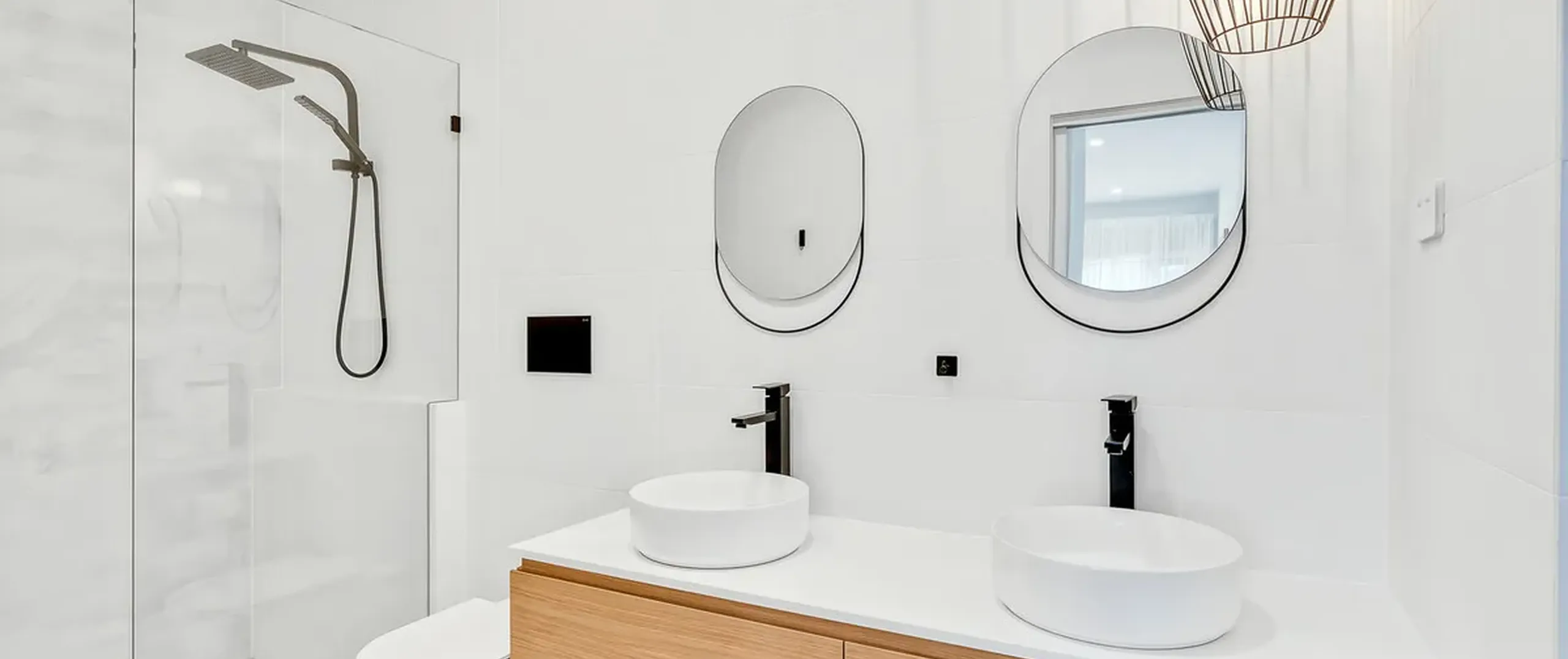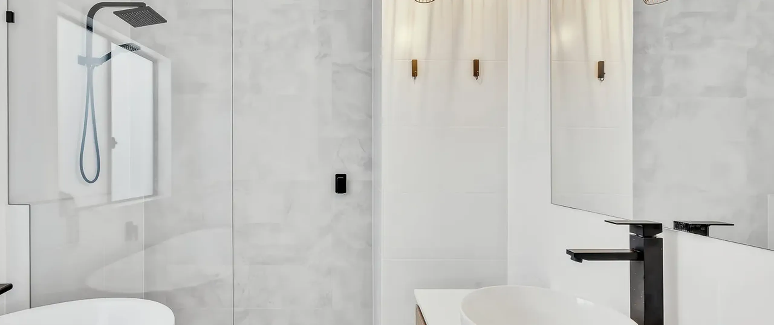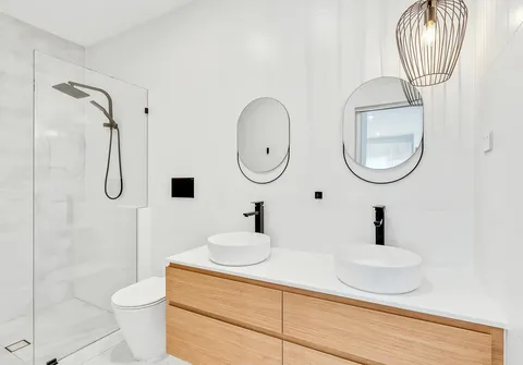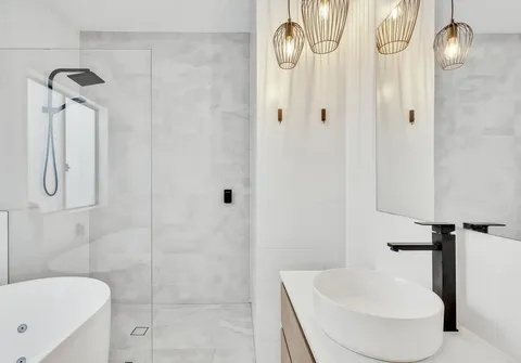 - Sparkling main bathroom with shower, vanity, spa bath and floor to ceiling tiles