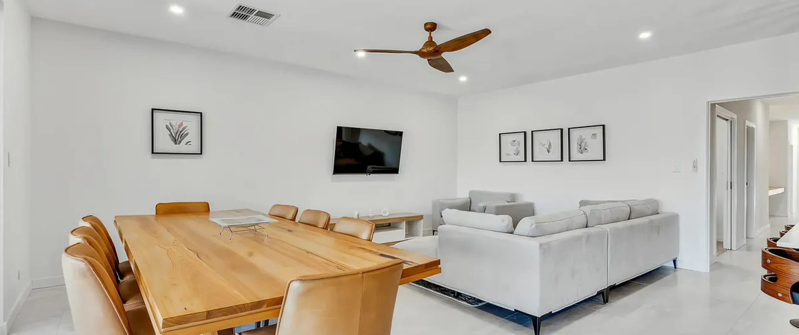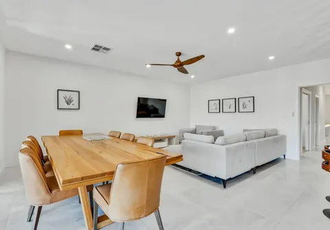 - Well-lit tiled open plan dining and living with ceiling fan and downlights