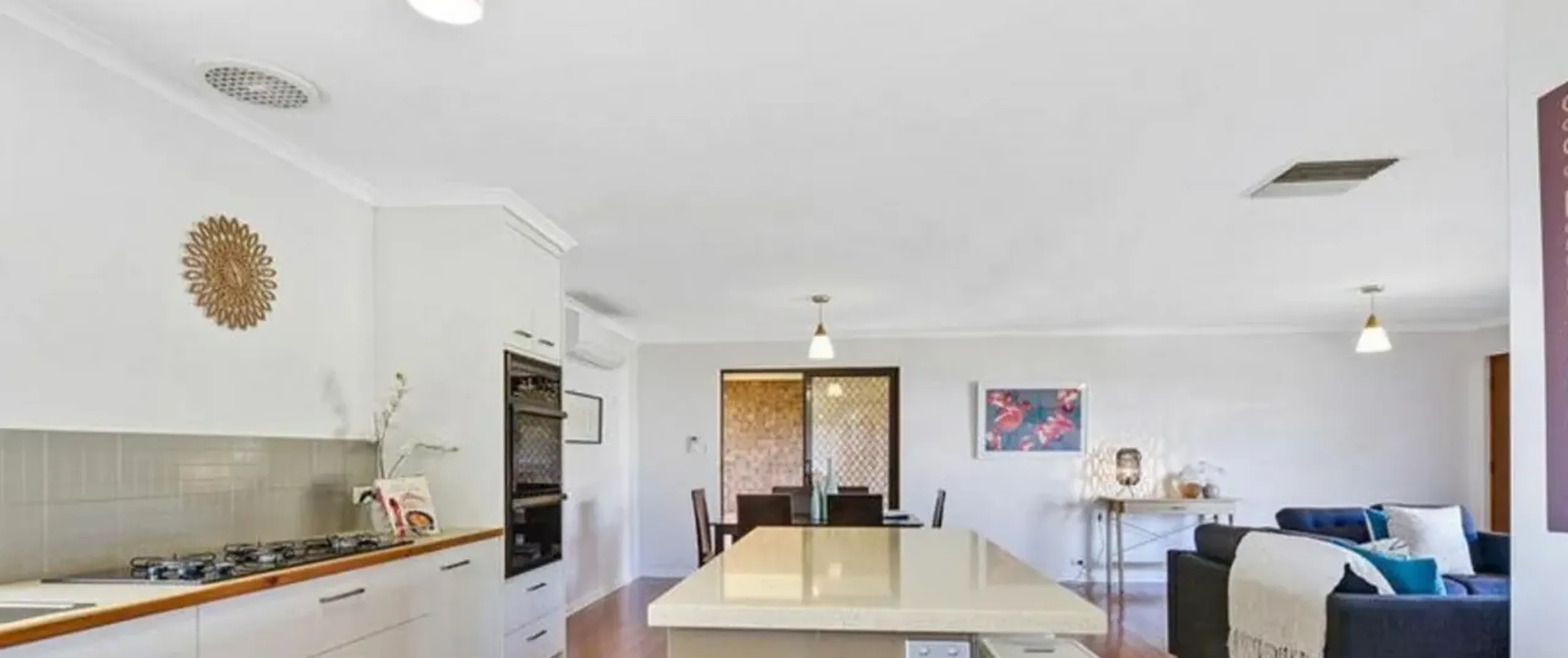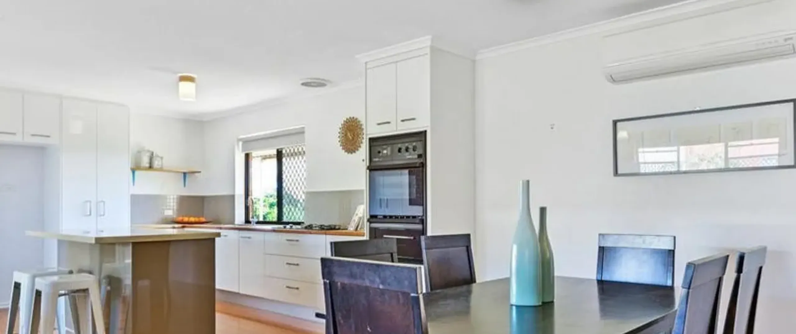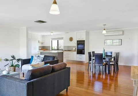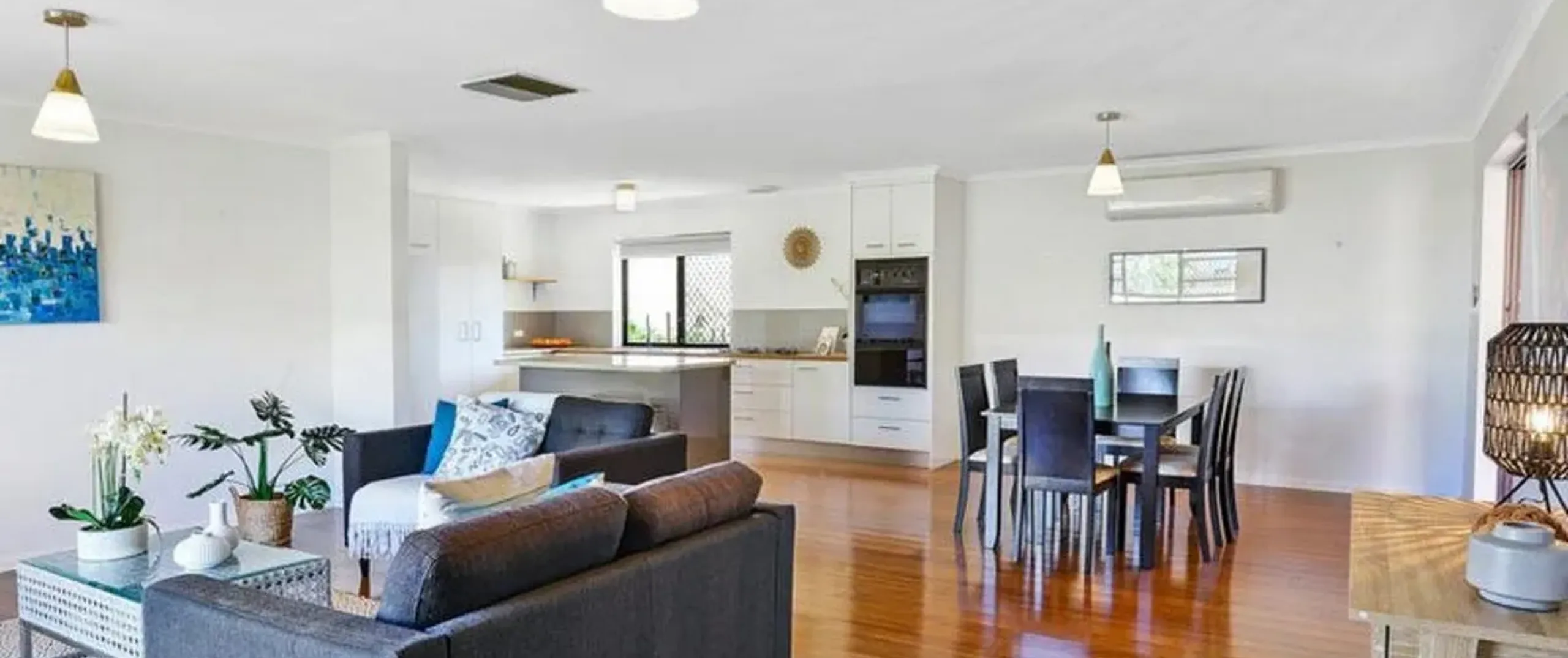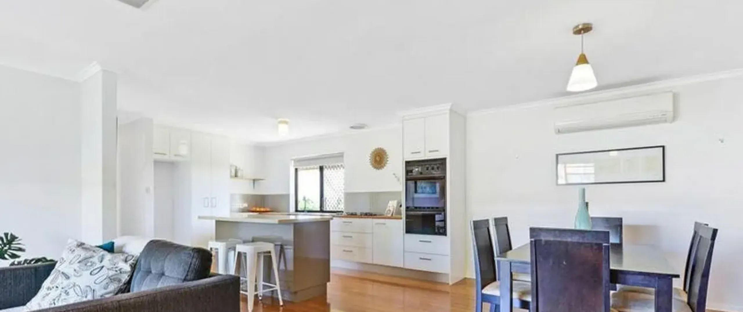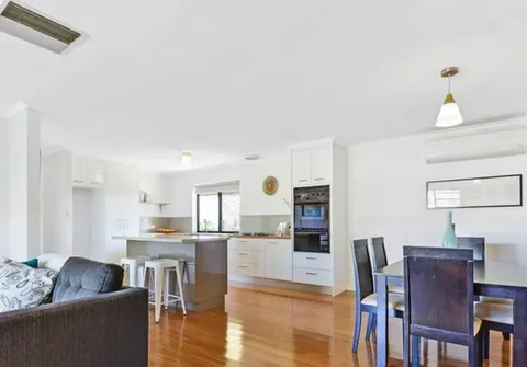- Spacious open plan lounge, kitchen and dining area with bamboo timber flooring and split system air conditioning and sliding doors leading to the carport