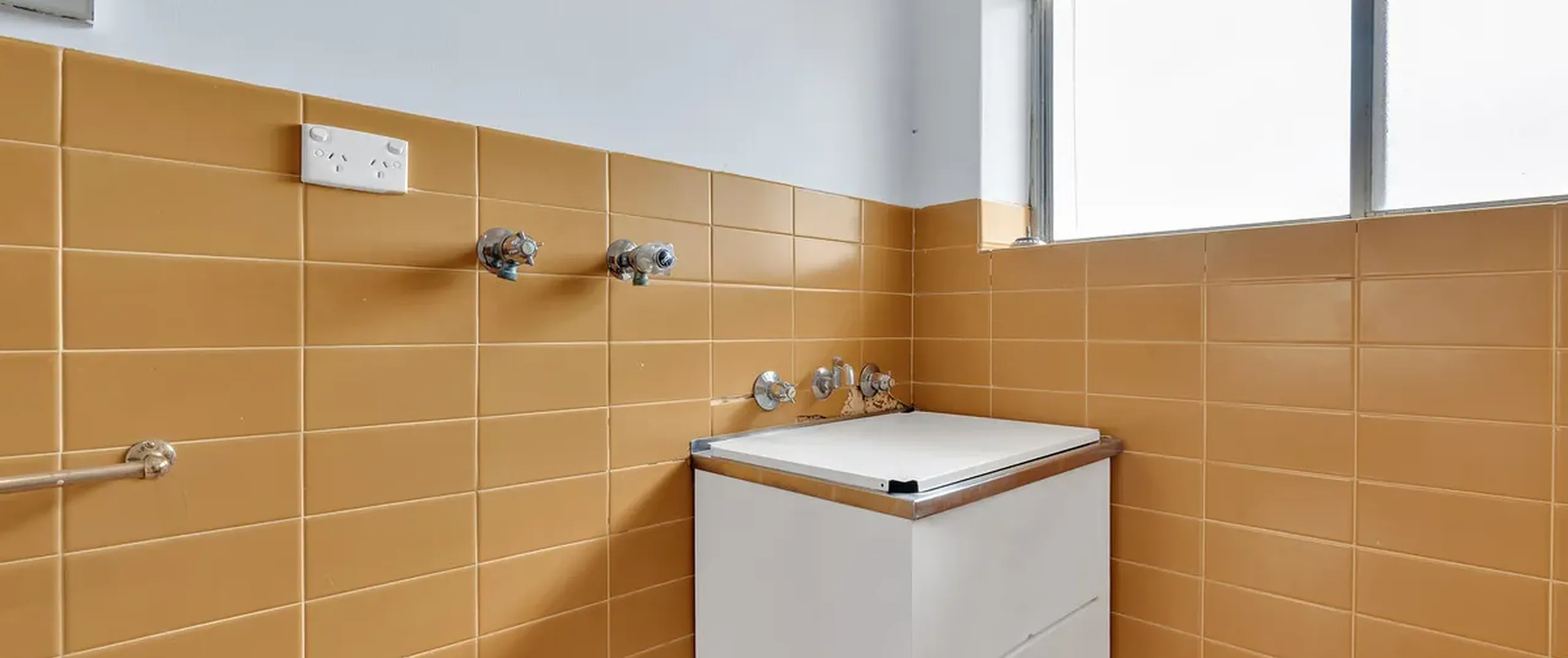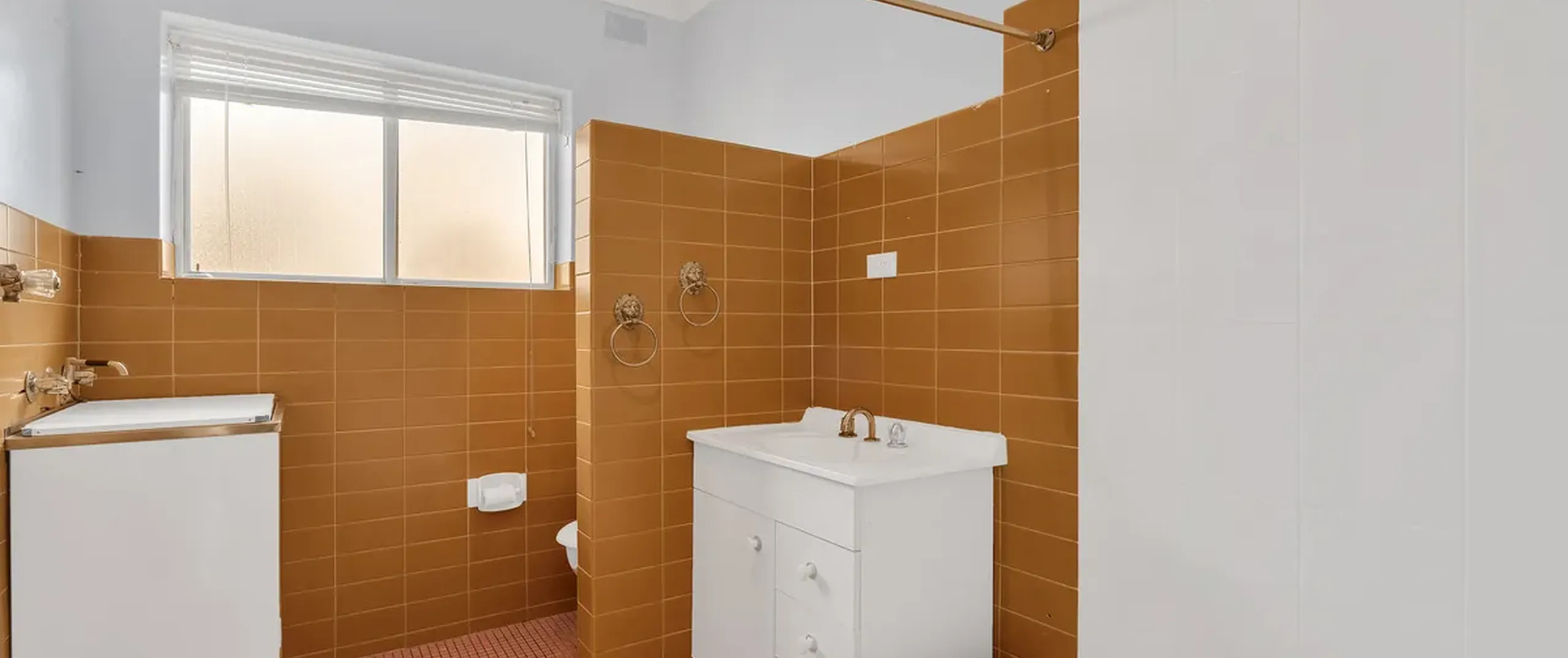 - Light filled bathroom with bath and shower connected, toilet, vanity with additional storage and laundry facilities
