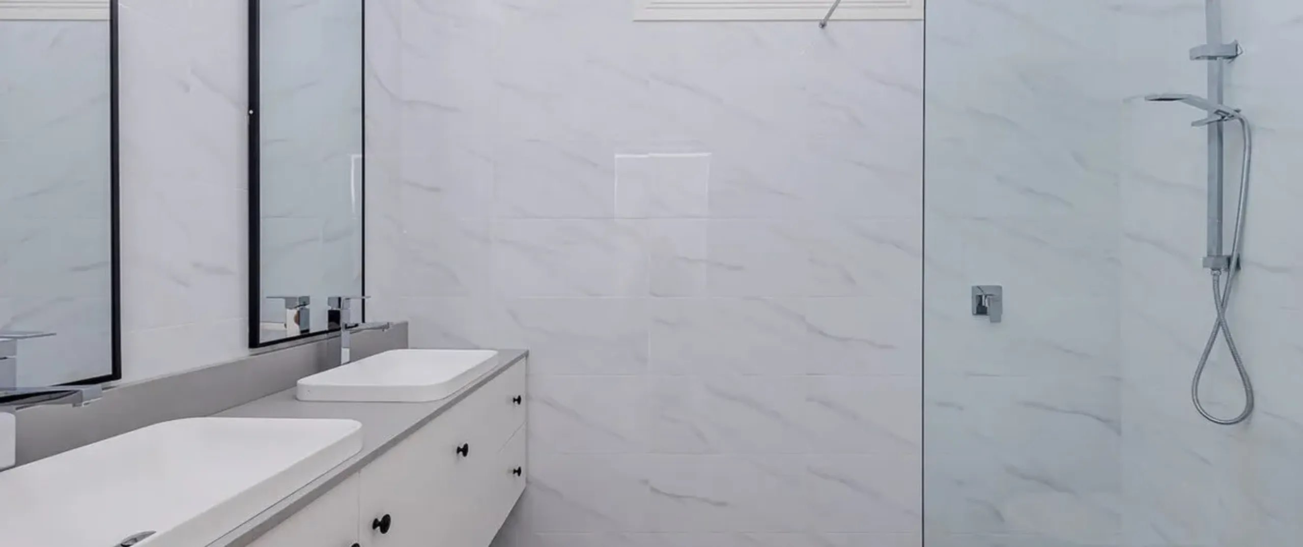 - Modern main bathroom with spacious double vanity, floor to ceiling tiles, and laundry facilities