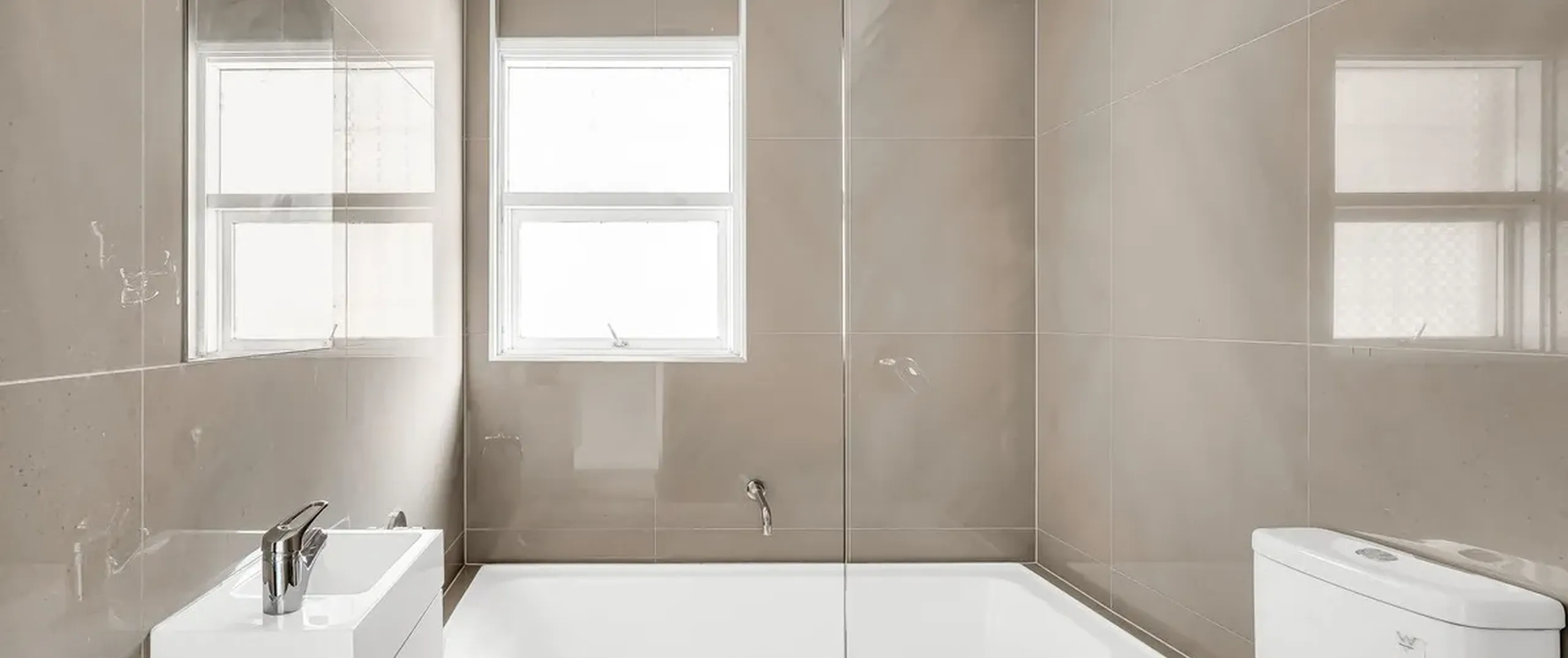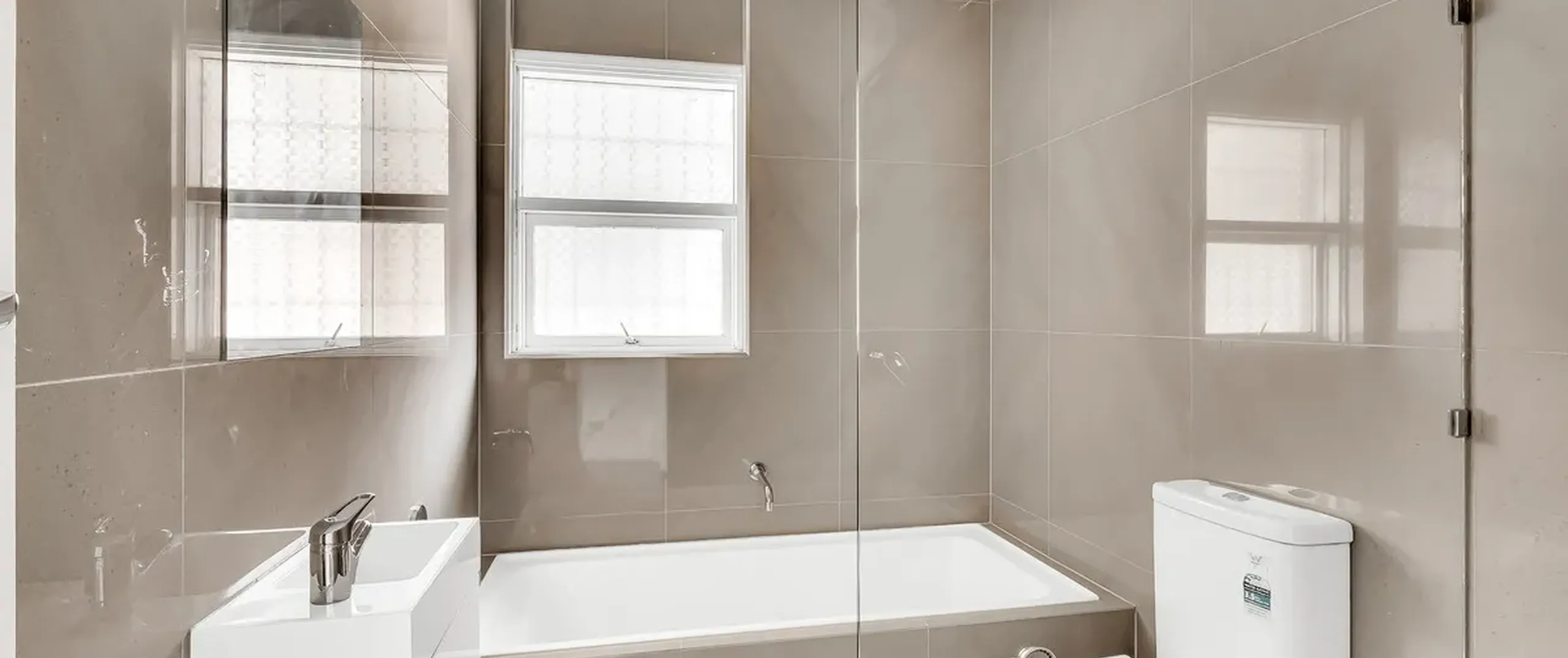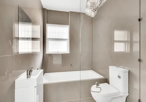 - Bathroom with floor to ceiling tiles completed by separate bath and shower