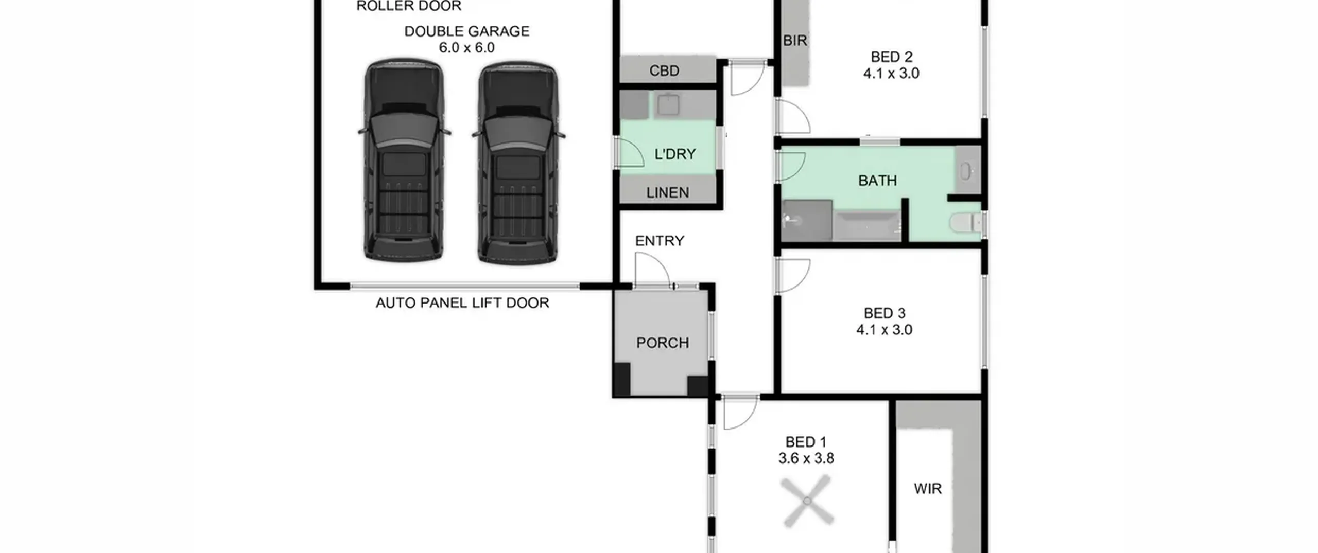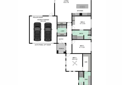 - Double-width garage with automatic panel lift door with both external and internal access