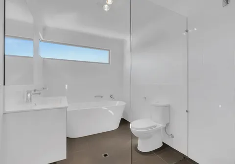 - Stylish main bathroom with free-standing bathtub and separate shower, complete with floor-to-ceiling tiles and vanity for additional storage space