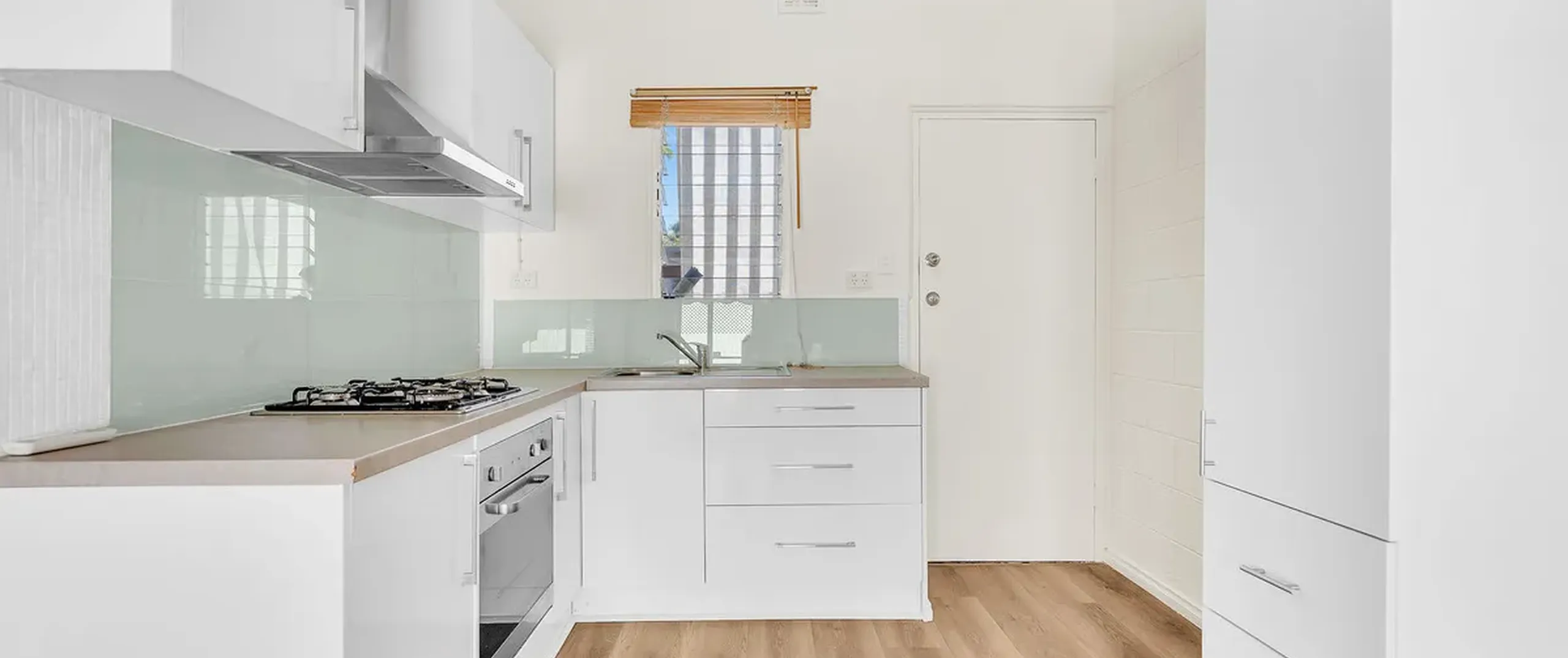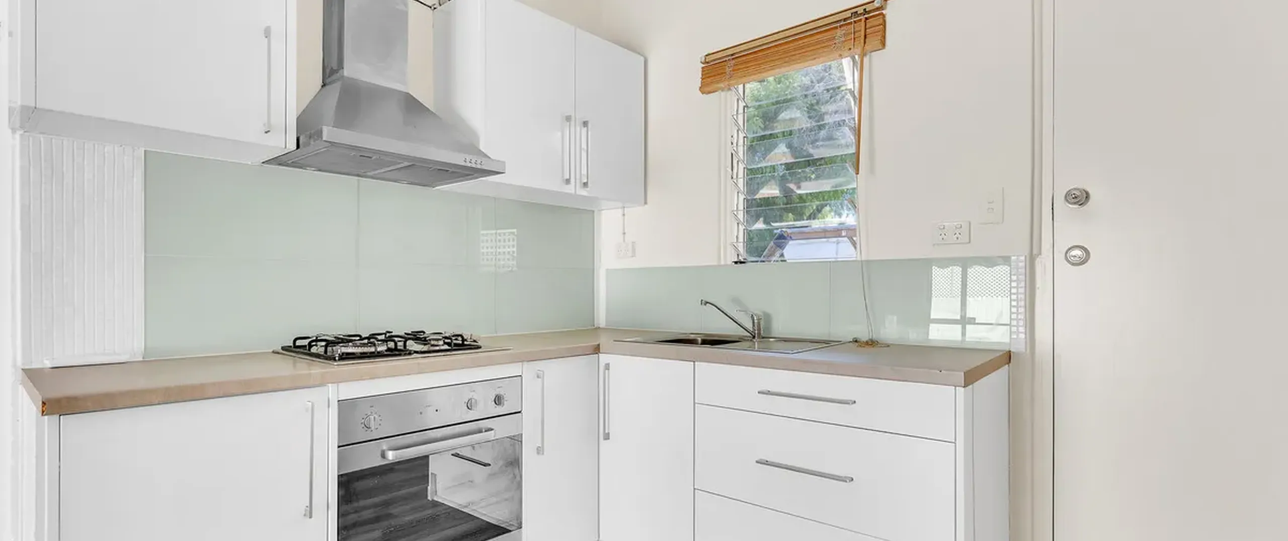 - Spacious kitchen with gas cooking, electric oven, rangehood, pantry cupboard and ample storage space