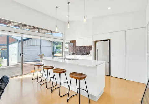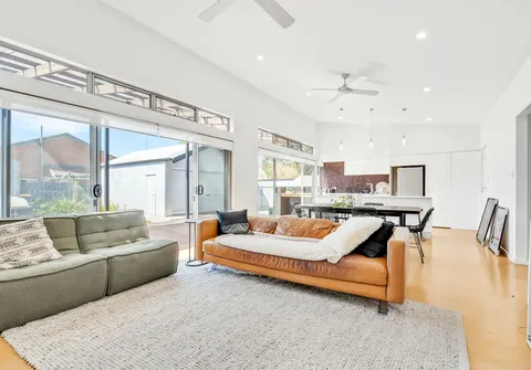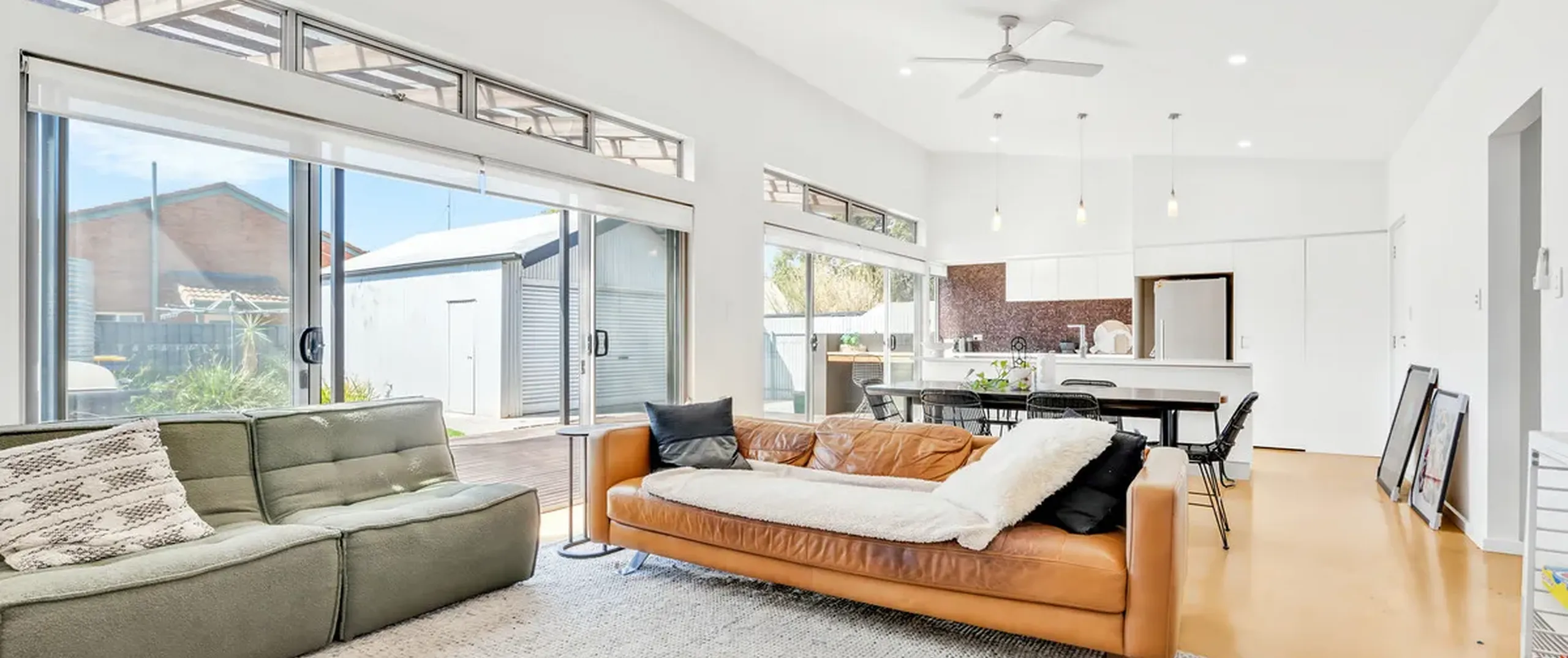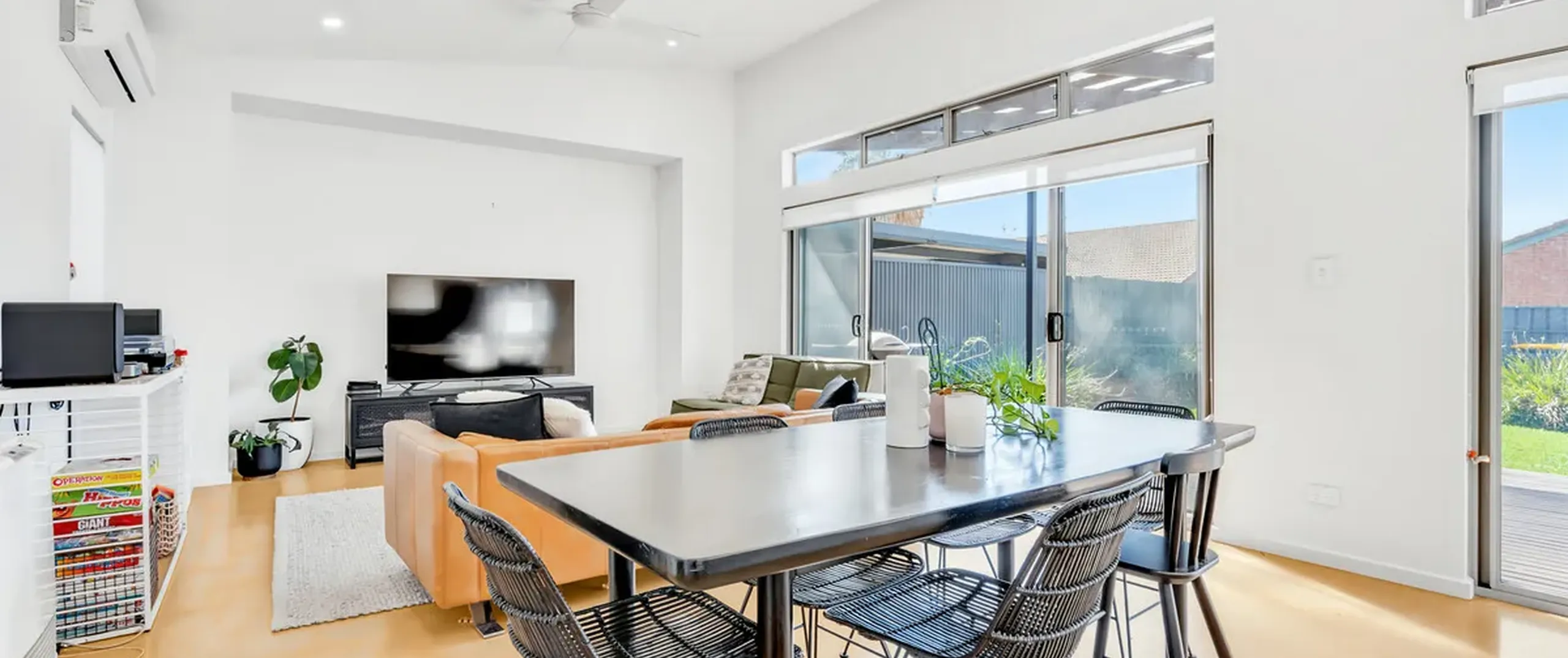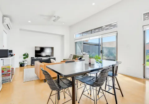 - Modern open plan living area with polished concrete floors, ceiling fan & split system a/c