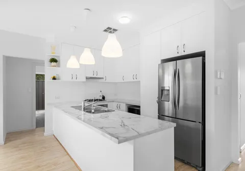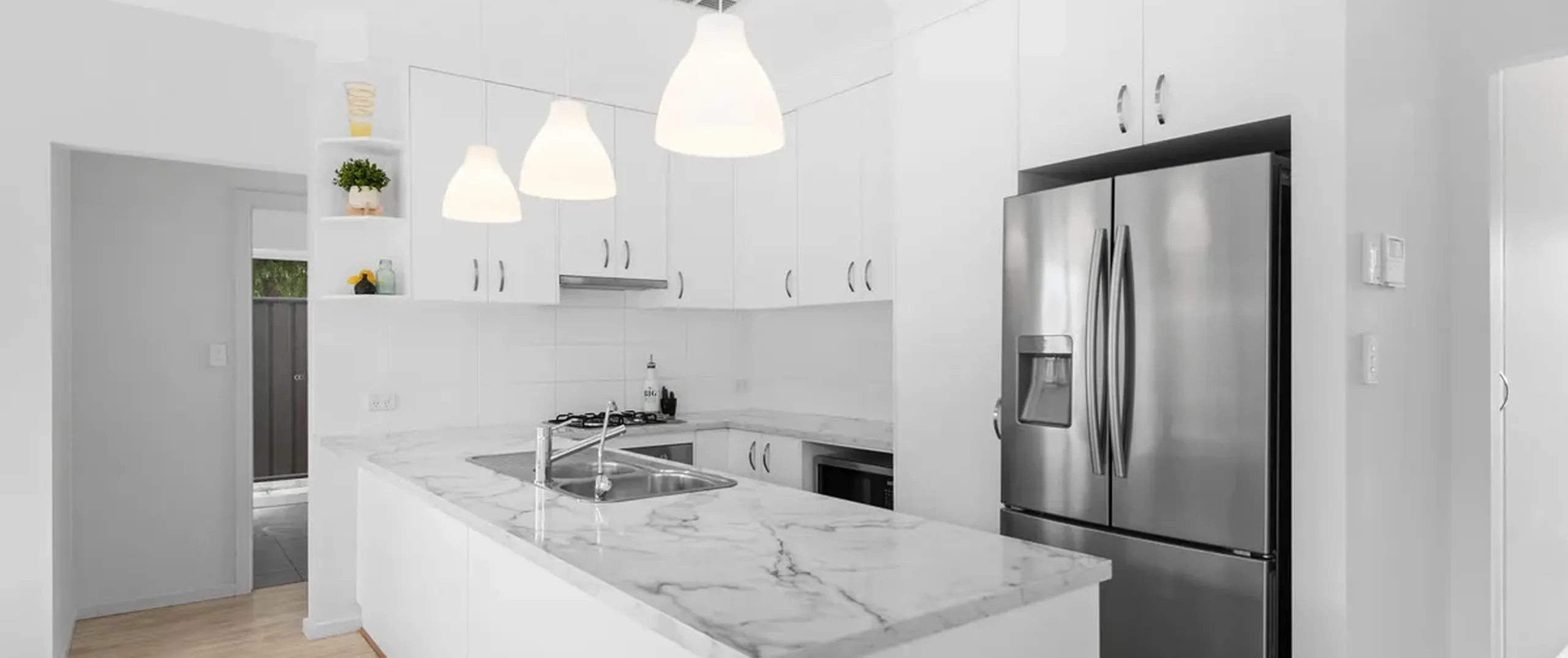 - Contemporary kitchen with marble look benchtops, ample cupboard and bench space and feature pendants above breakfast bar
