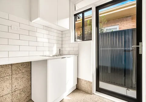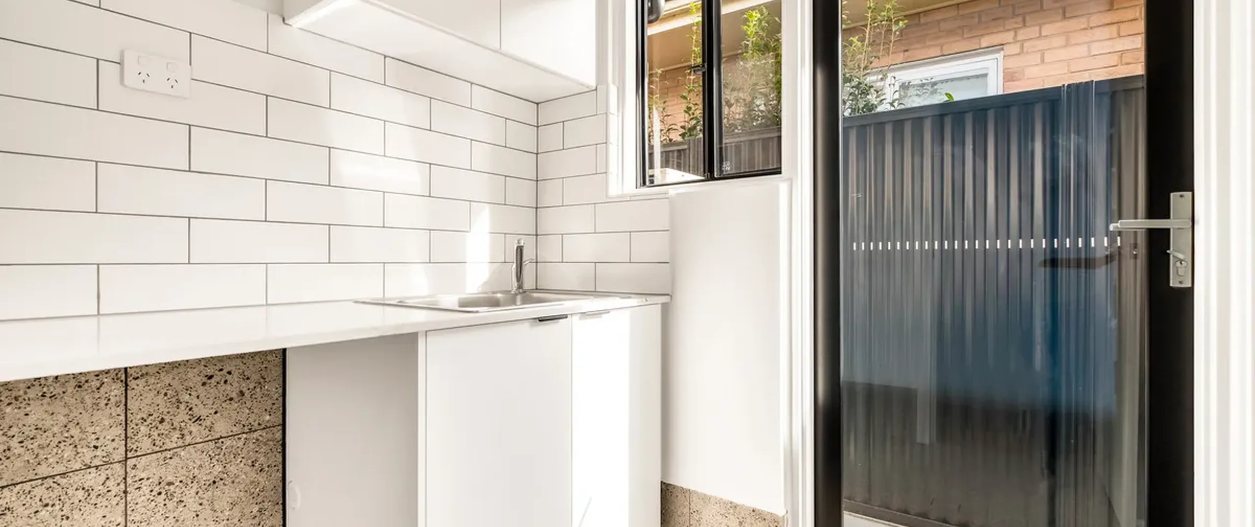 - Contemporary laundry with tiled splash back, sink, ample cupboard and bench space and external access