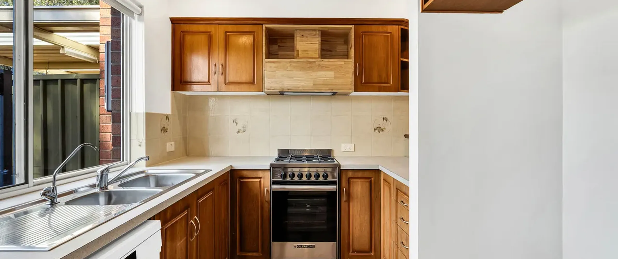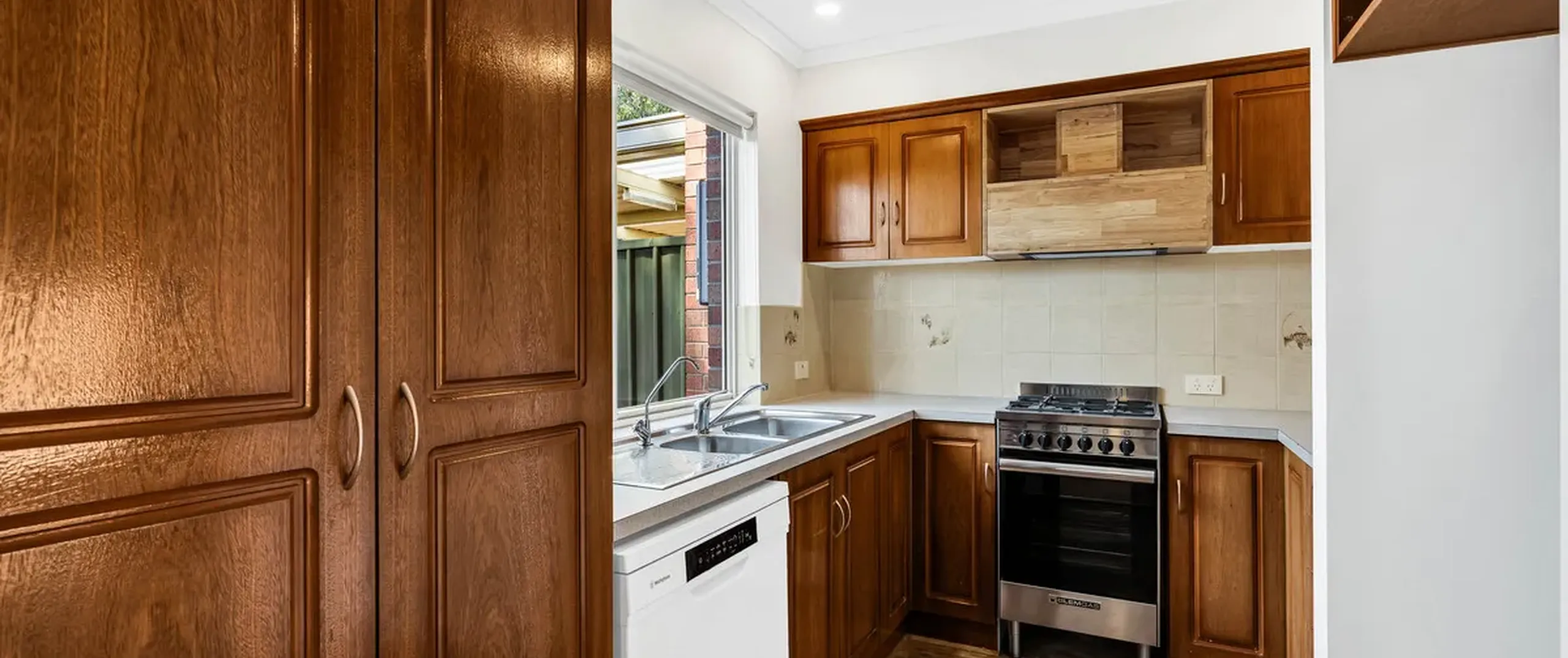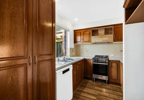 - Timber kitchen with gas cooktop, oven, dishwasher and ample cupboard storage