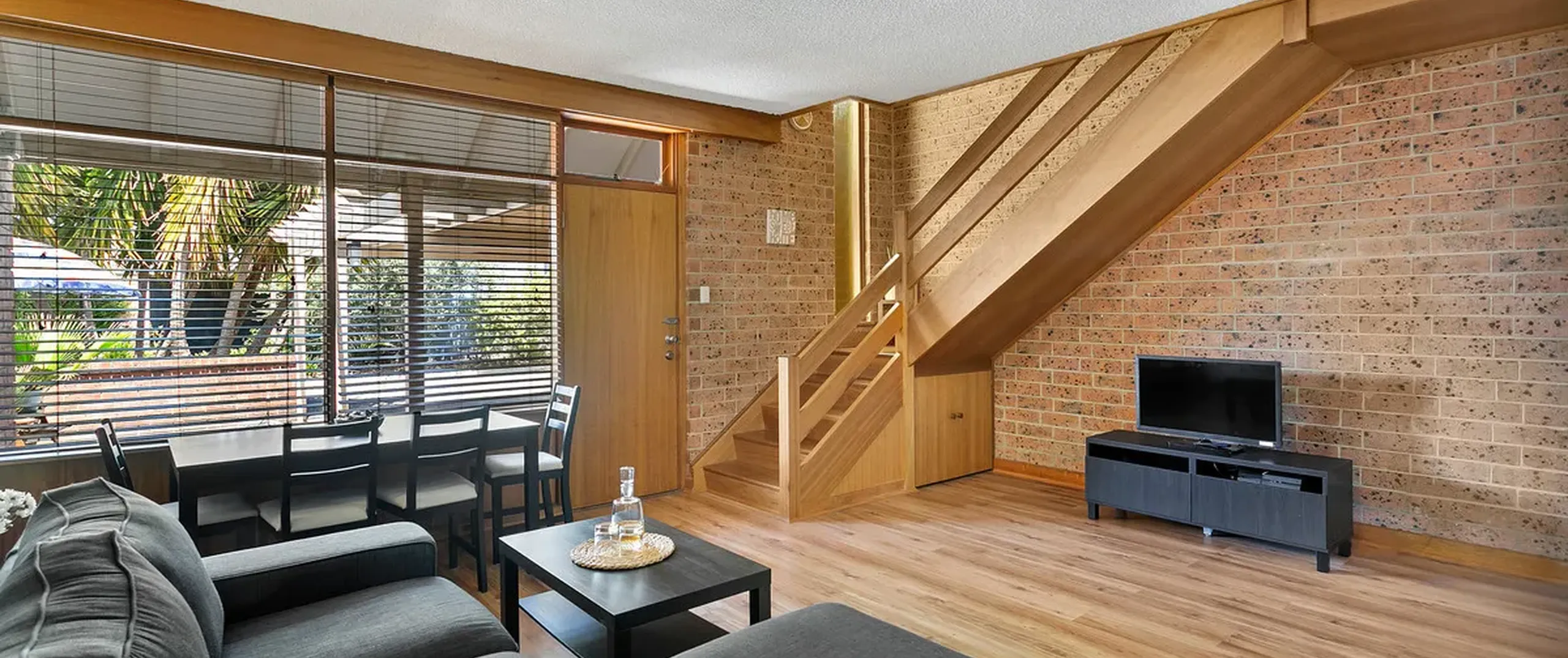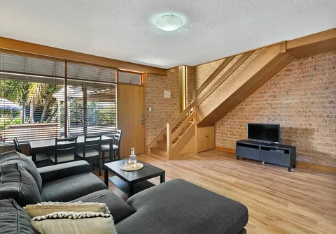 - Good sized, light filled lounge and dining area with gas space heater and elegant floating timber floorboards