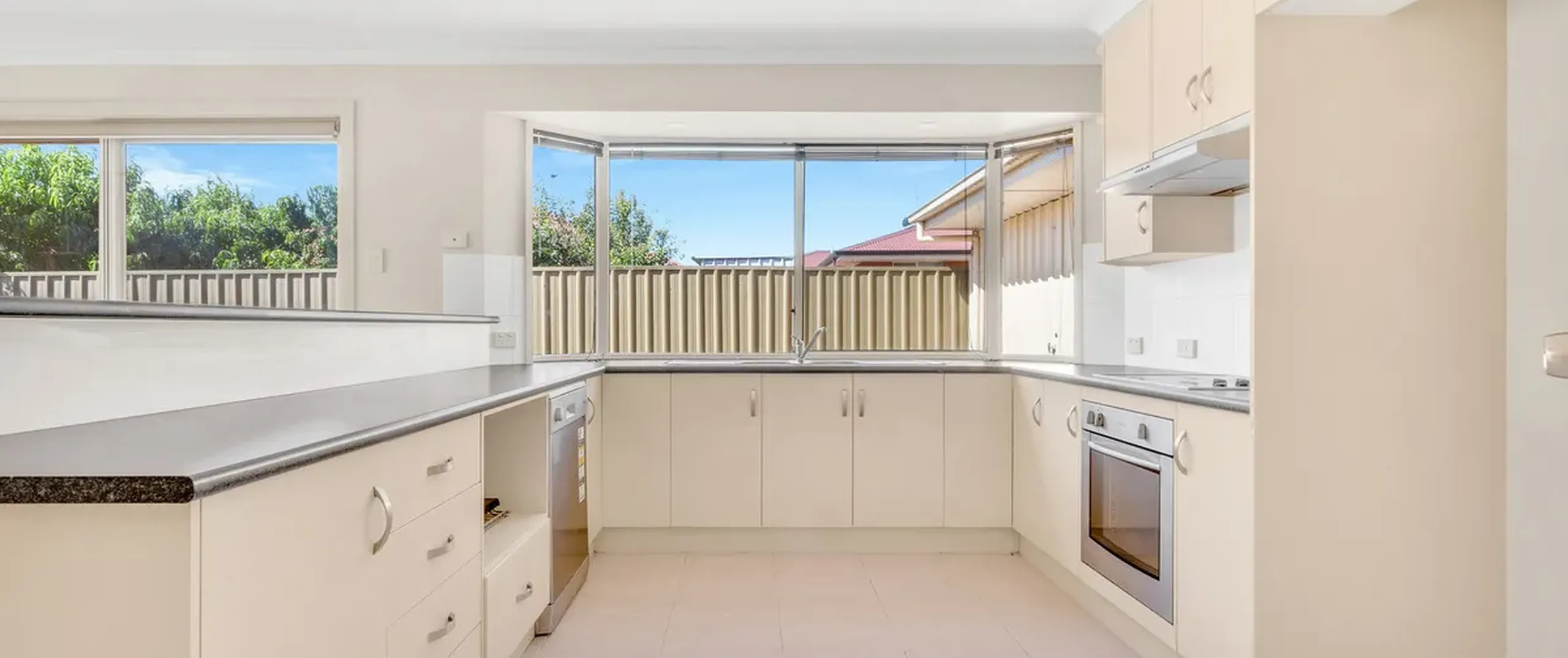 - Large Kitchen with ample storage and bench space, stainless steel appliances, electric cooktop and built-in oven