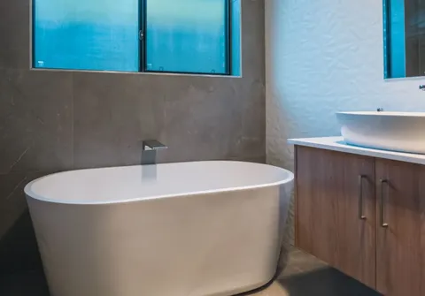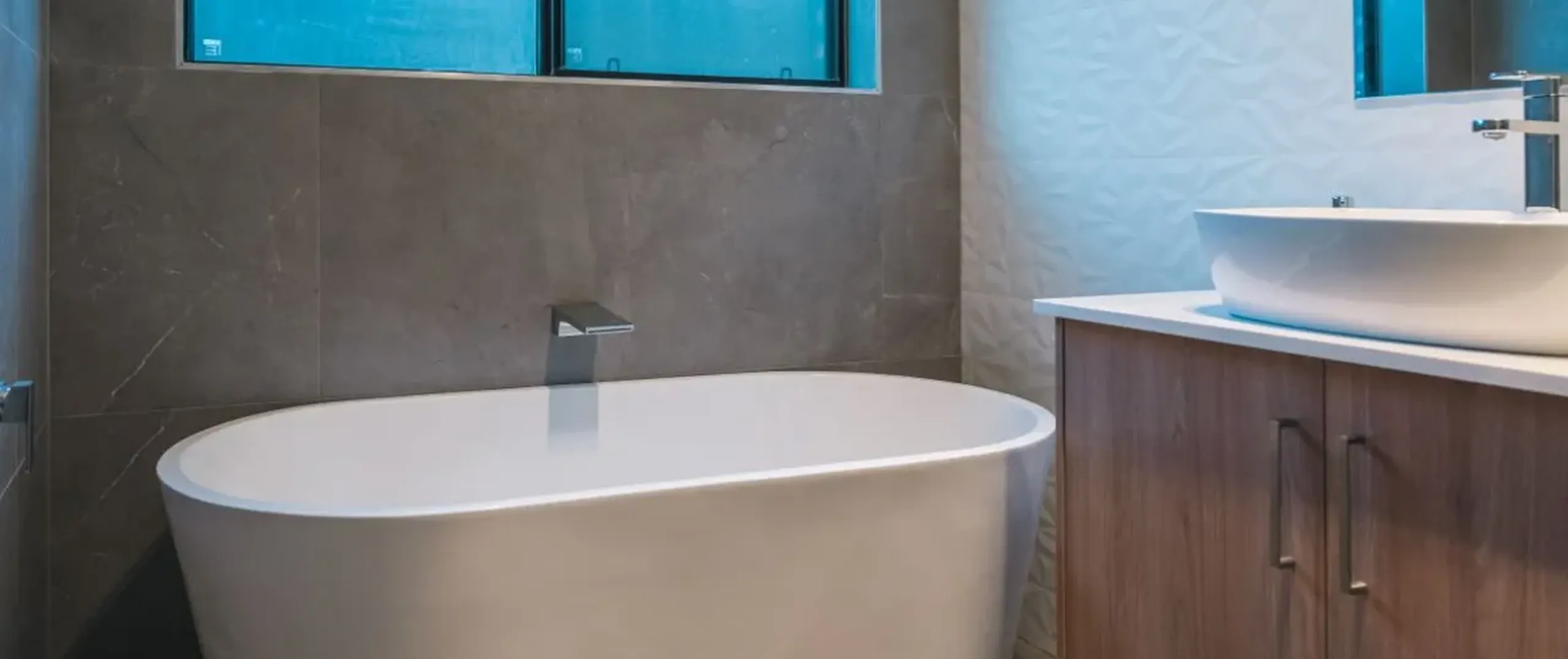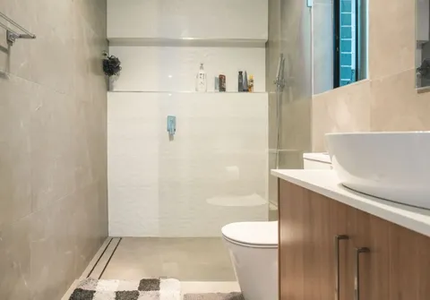 - Sparkling main bathroom with floor-to-ceiling tiles and separate bath and shower