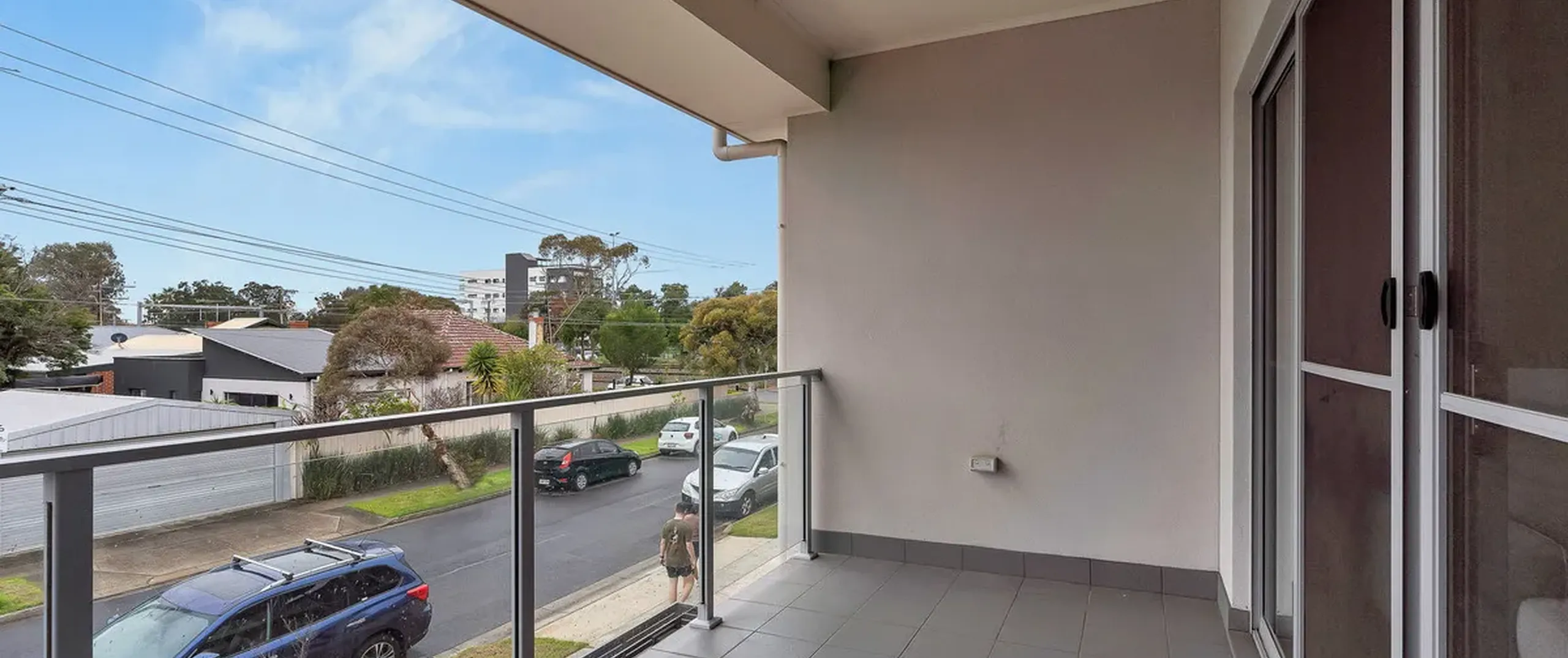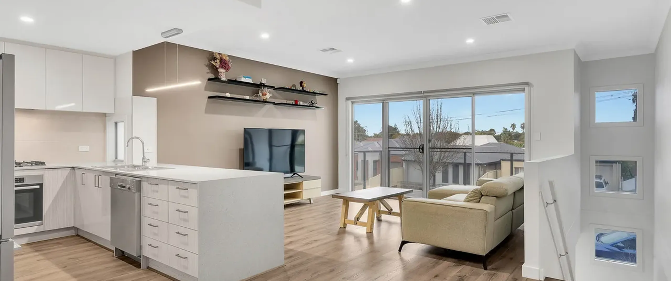 - Open plan lounge and kitchen upstairs with glass sliding doors opening to the balcony