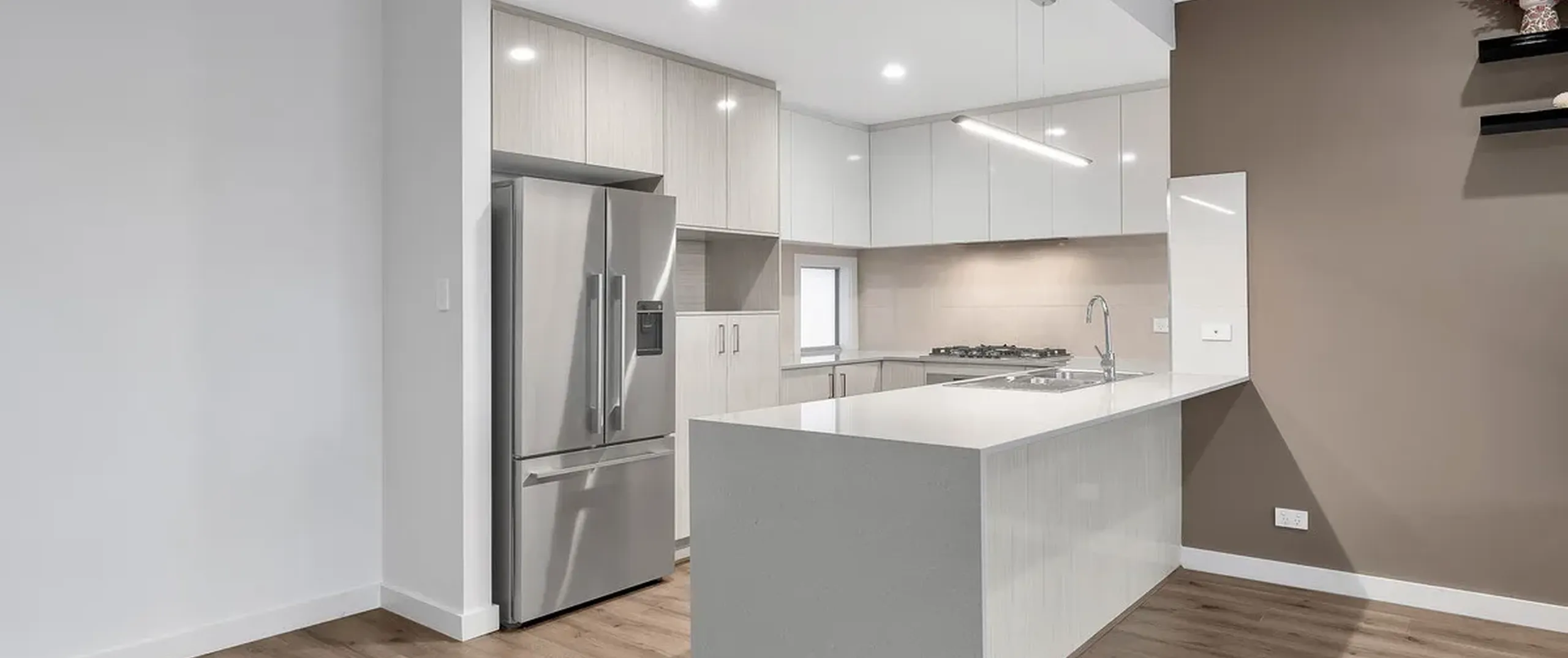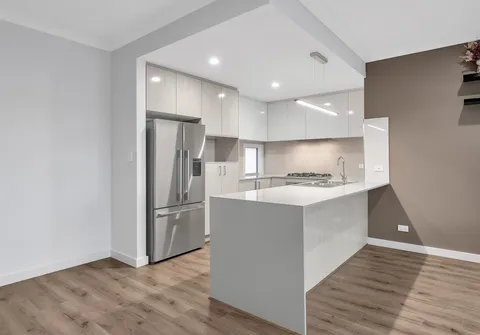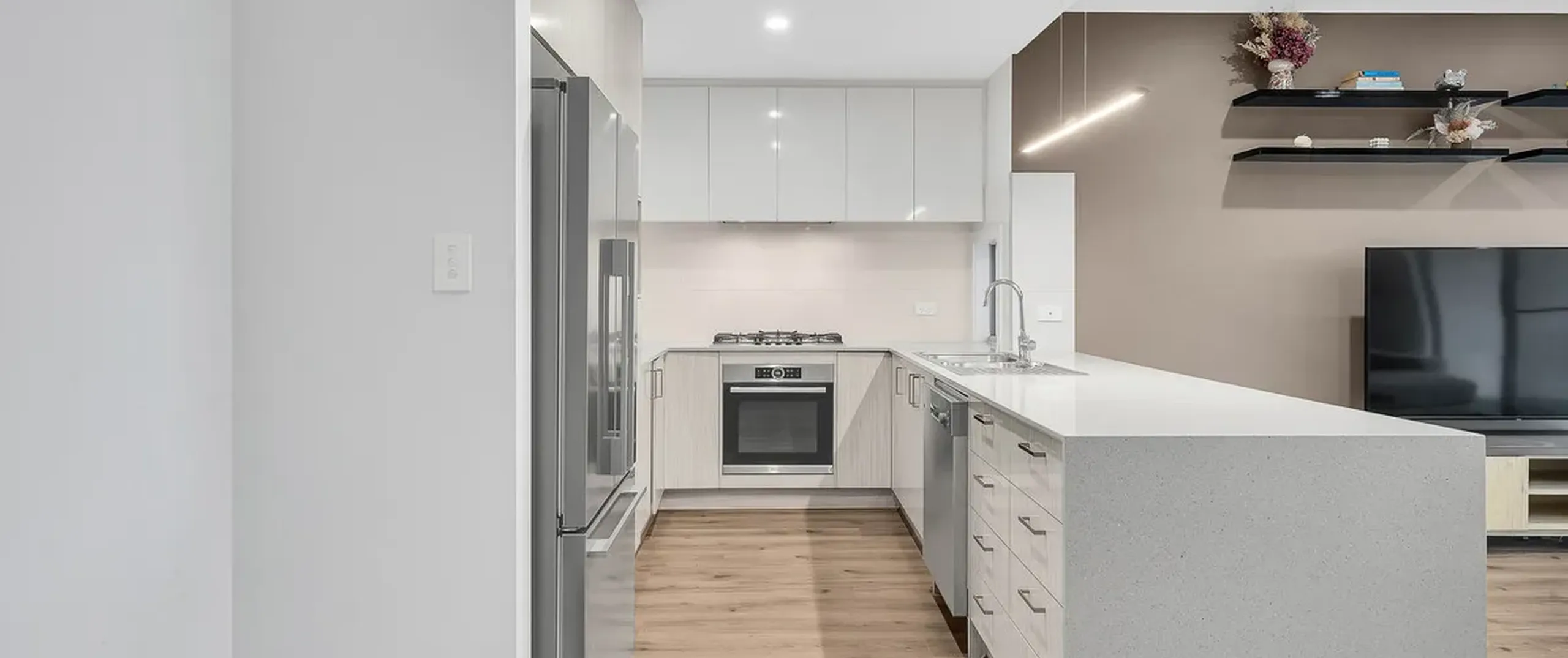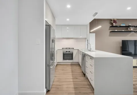 - Bright chic kitchen stainless steel appliances including a gas cooktop, electric oven, dishwasher, ample storage space and breakfast bar with waterfall stone benchtop
