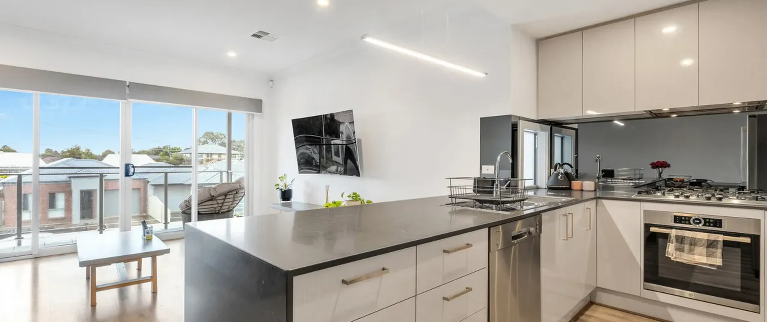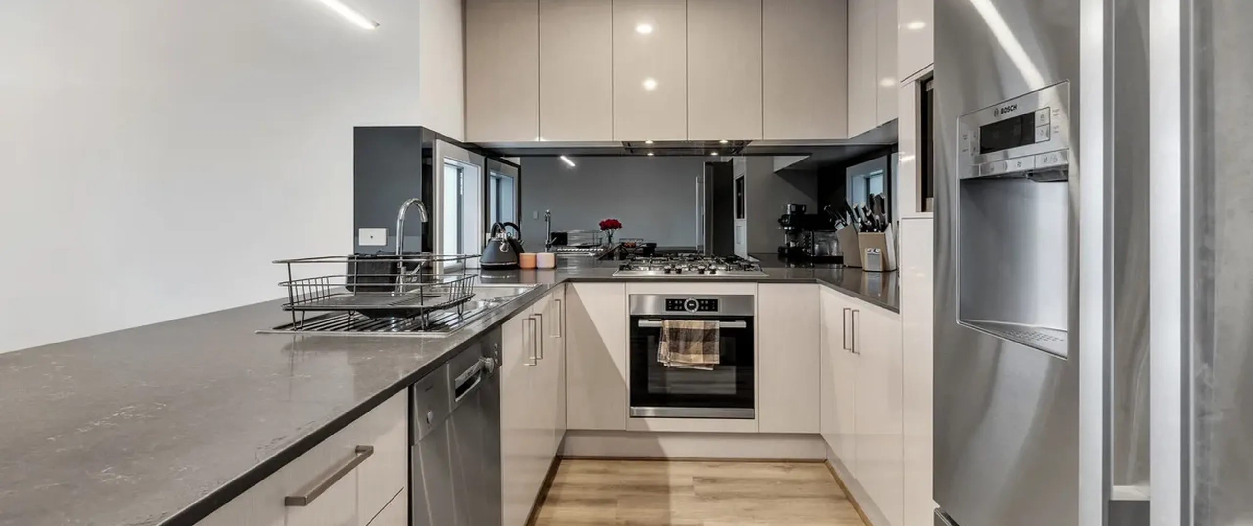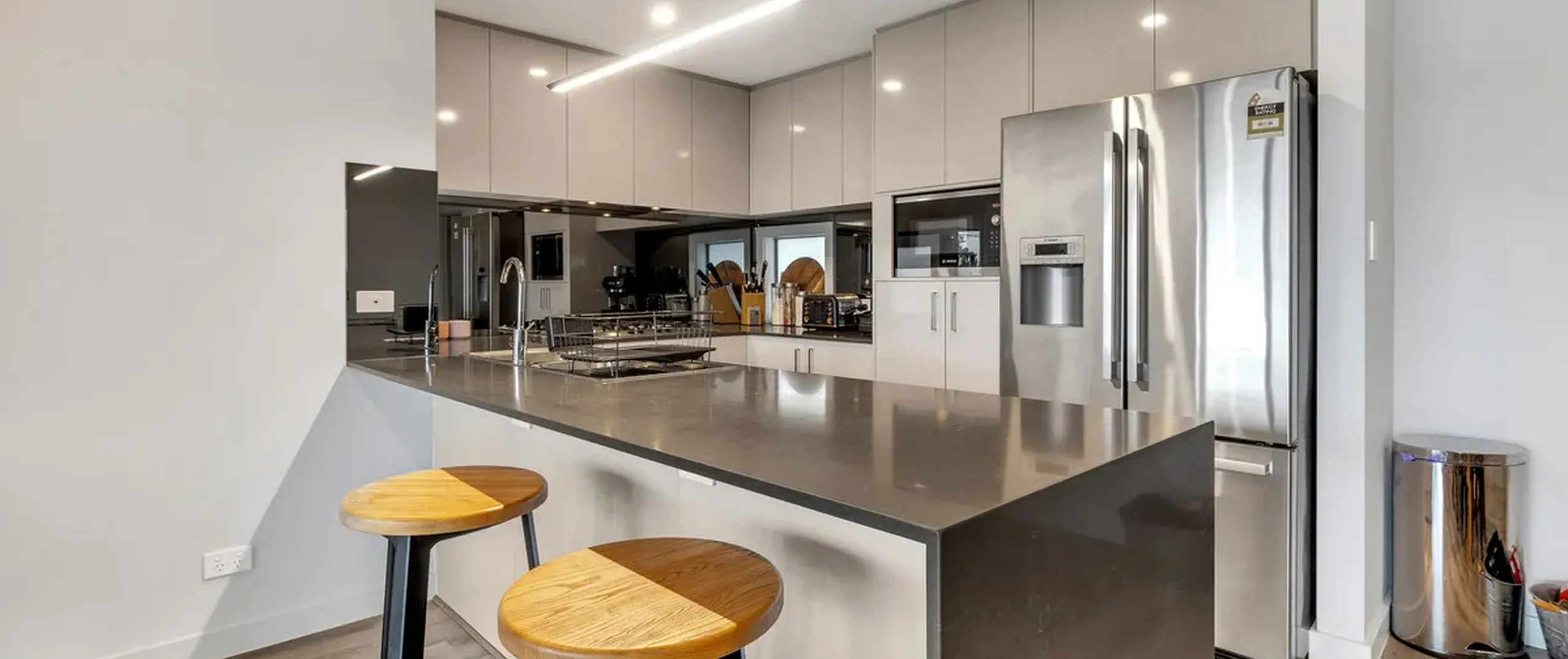 - Bright chic kitchen stainless steel Bosch appliances including a gas cooktop, electric oven, dishwasher, ample storage space and breakfast bar with waterfall stone benchtop