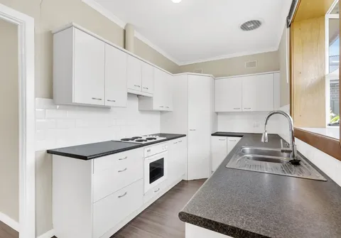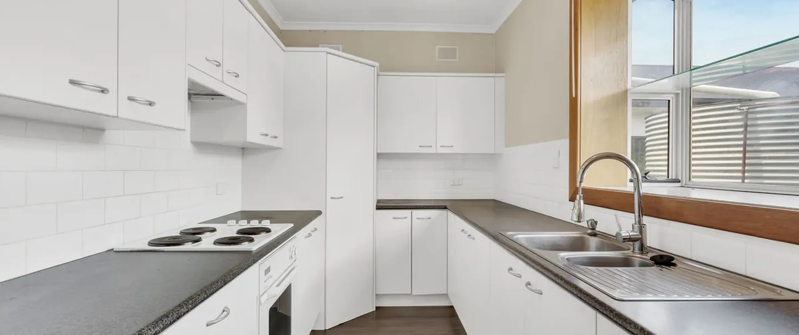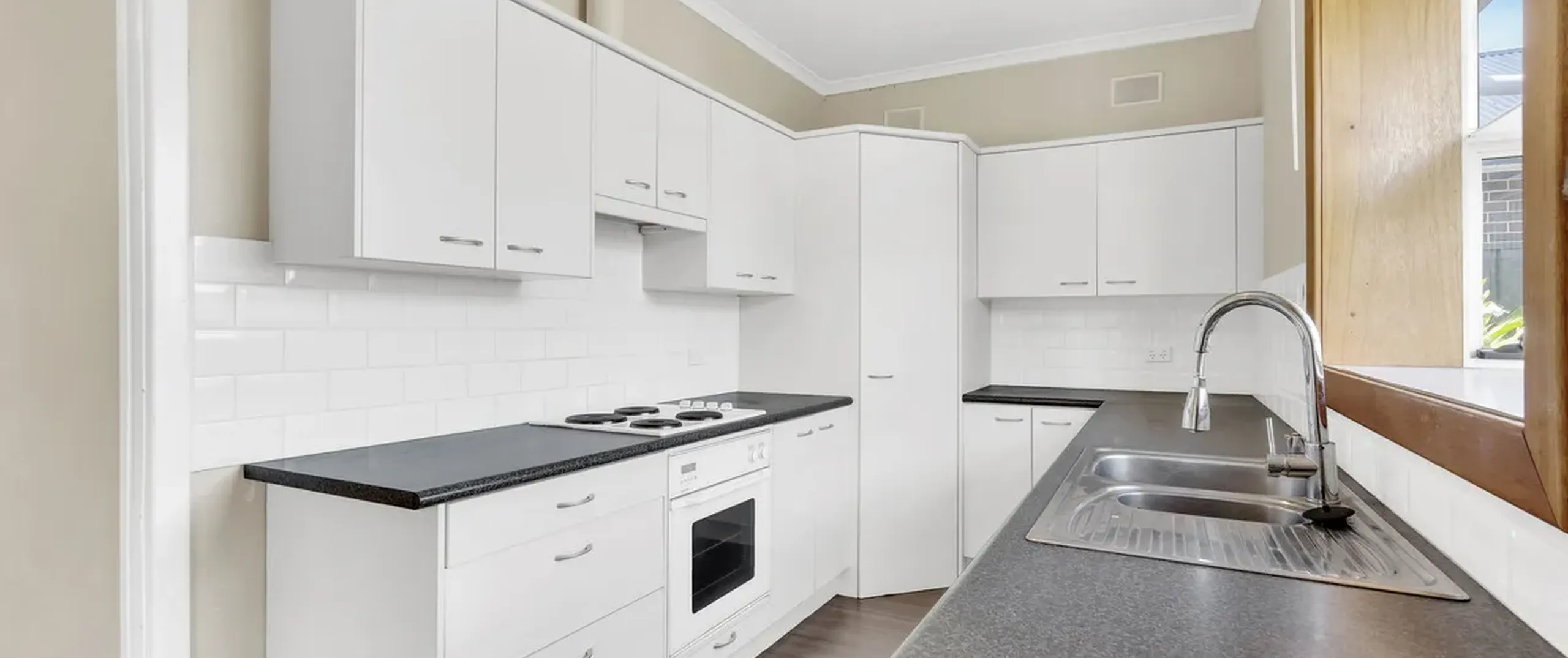 - Updated galley style kitchen with gas cooktop, dual sink, pantry, and ample cupboard and bench space