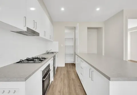 - Modern kitchen boasting stainless steel appliances, feature tiled splashback, stone look laminated bench tops, wide breakfast bar, walk-in pantry and ample cupboard and bench space