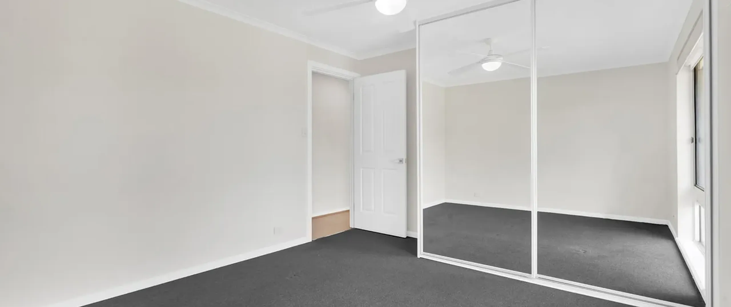 - Main bedroom with carpet, ceiling fan and built-in robe