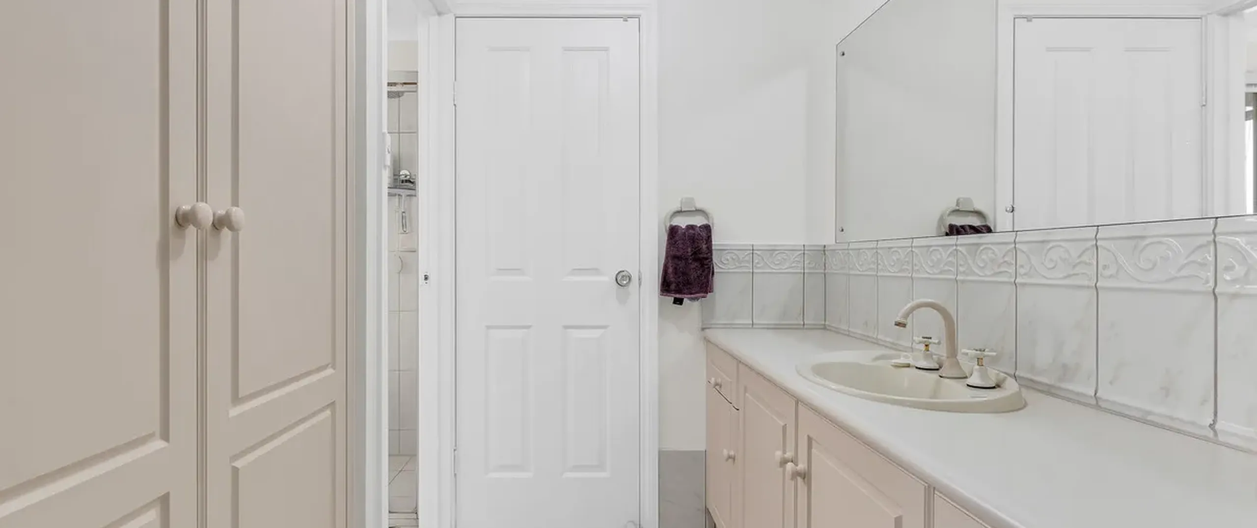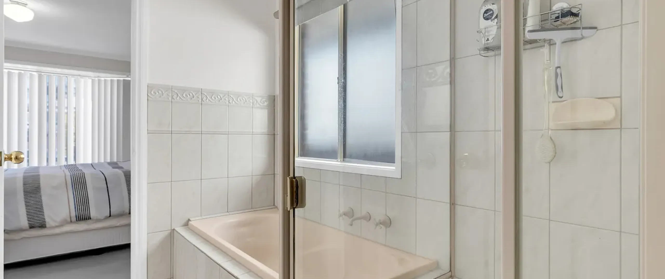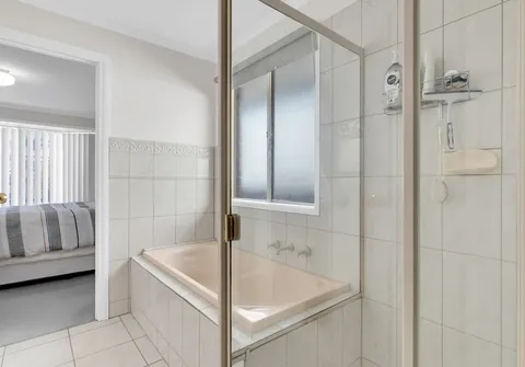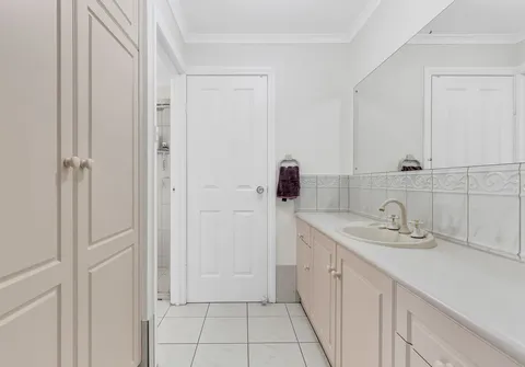- Neat and tidy two-way main bathroom with separate shower and bath tub, toilet and large vanity with ample storage and bench space