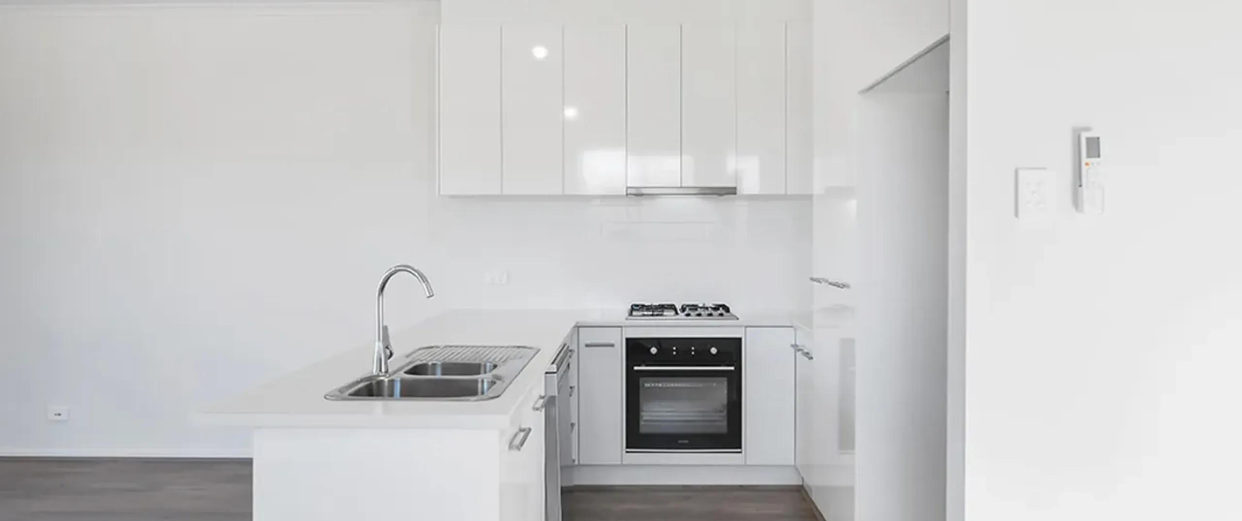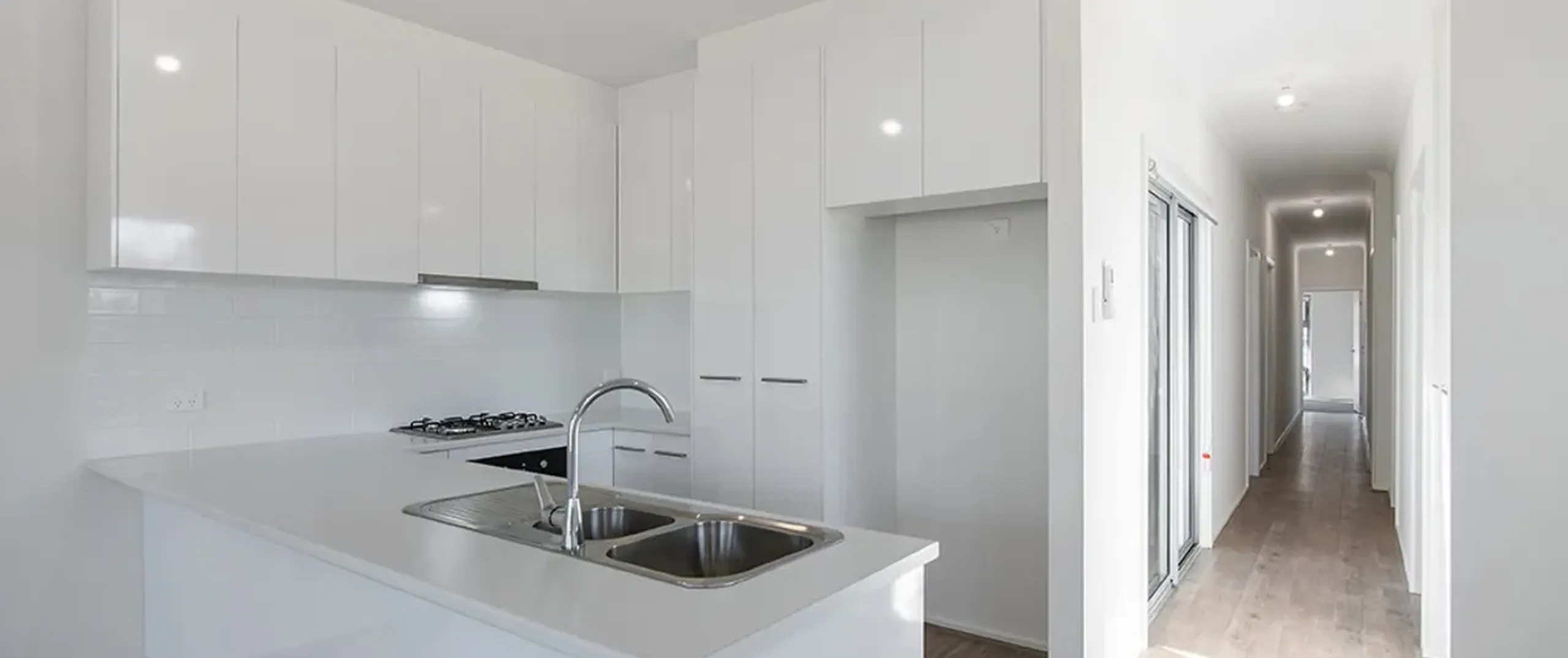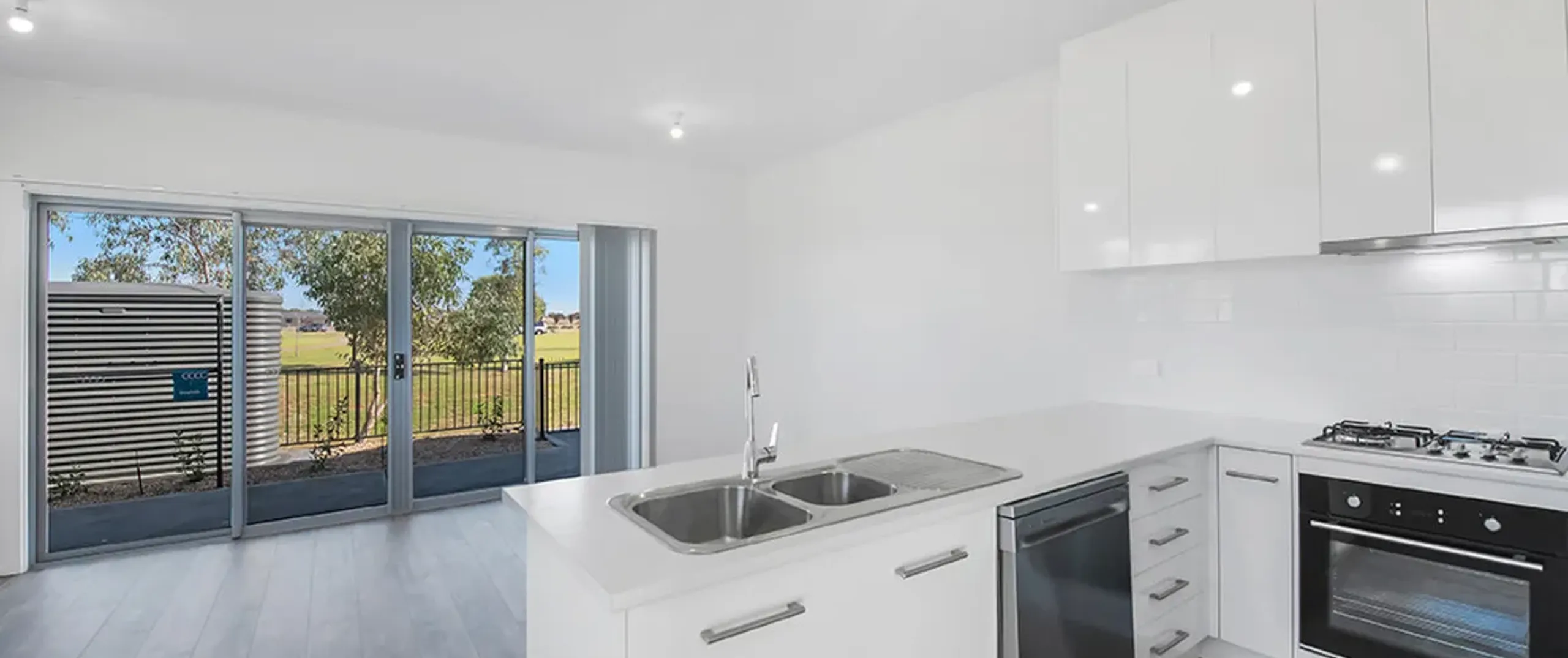 - Stylish modern kitchen boasting stainless steel appliances including gas cooktop, oven, dual sink and ample cupboard storage
