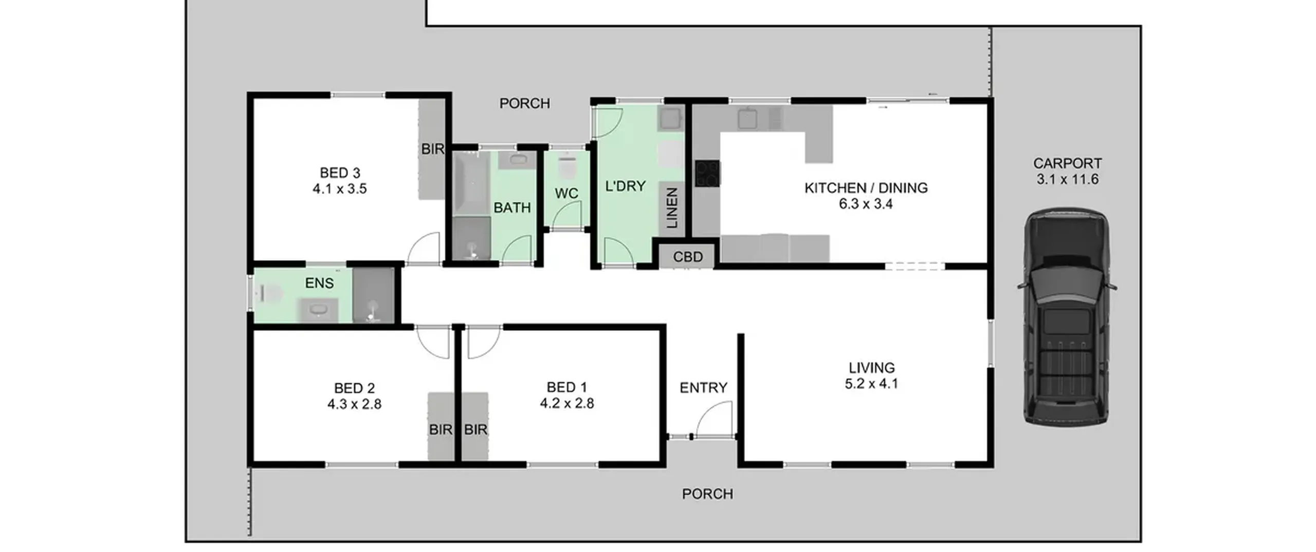 - Laundry with external access and built-in cupboards