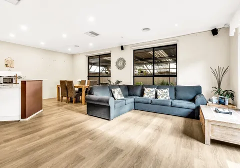 - Fantastic, bright open-plan dining and living area with floating timber floorboards throughout and glass sliding door opening to the verandah