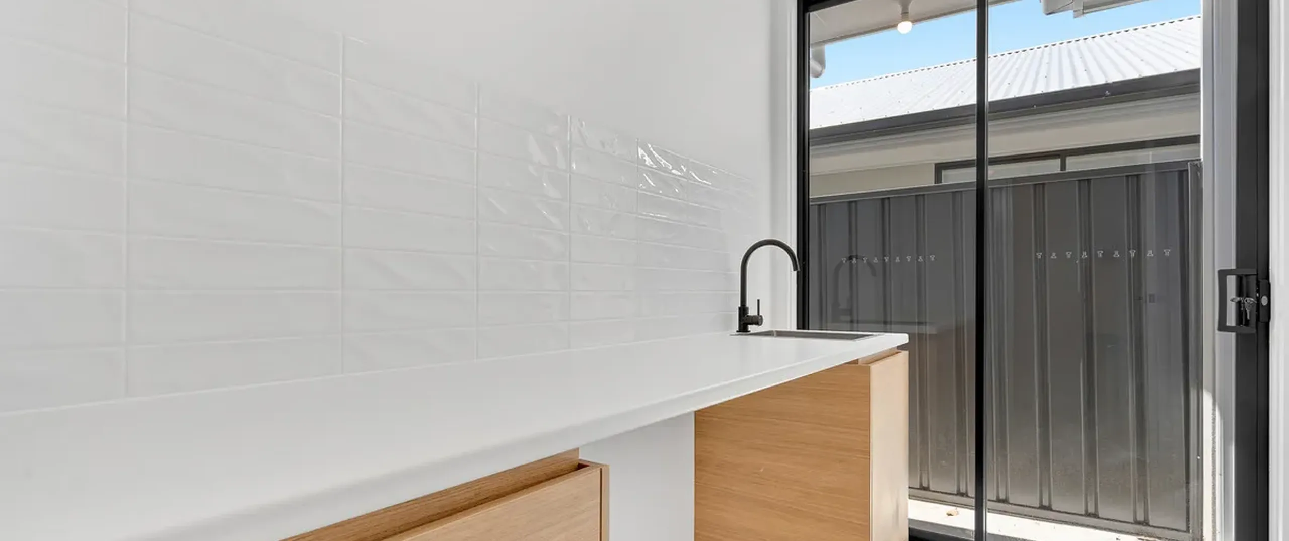 - Kitchen with Stone bench tops, dish washer, 900mm gas cooktop, 600mm Westinghouse electric oven