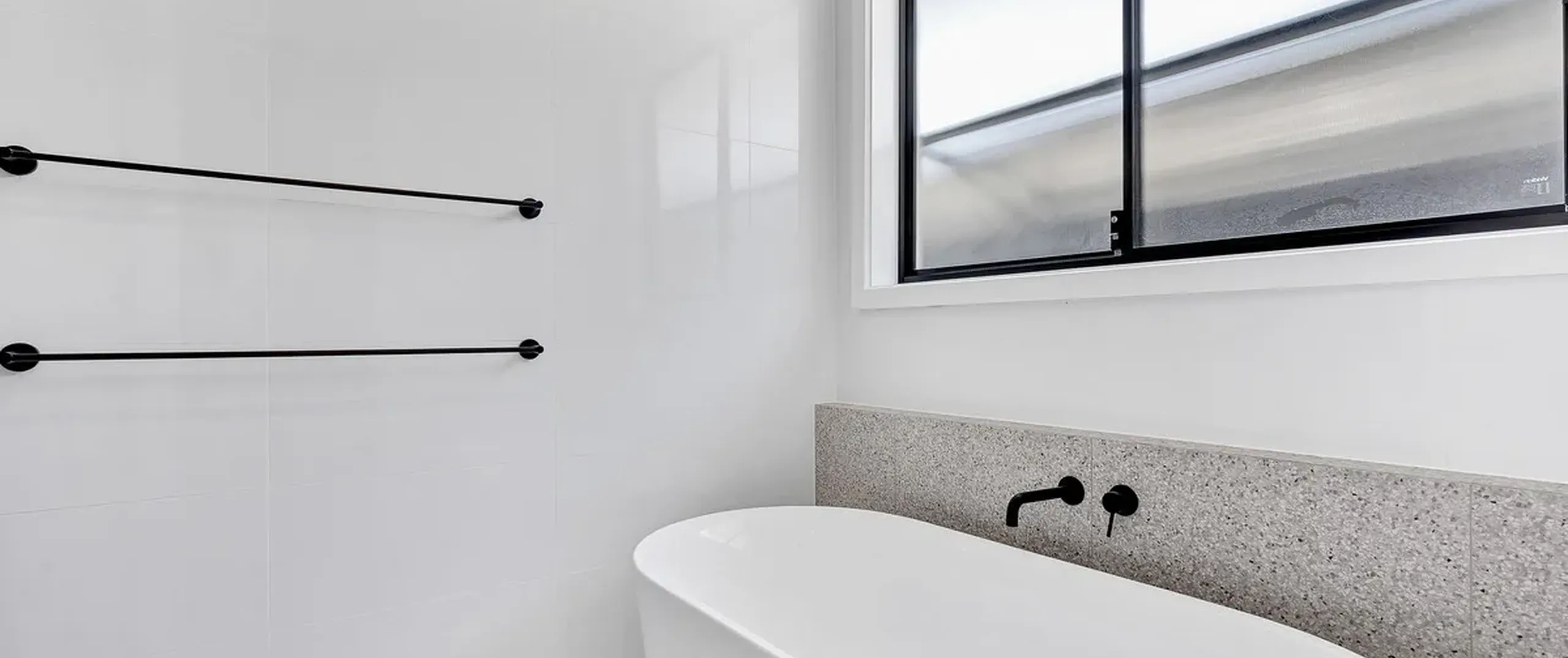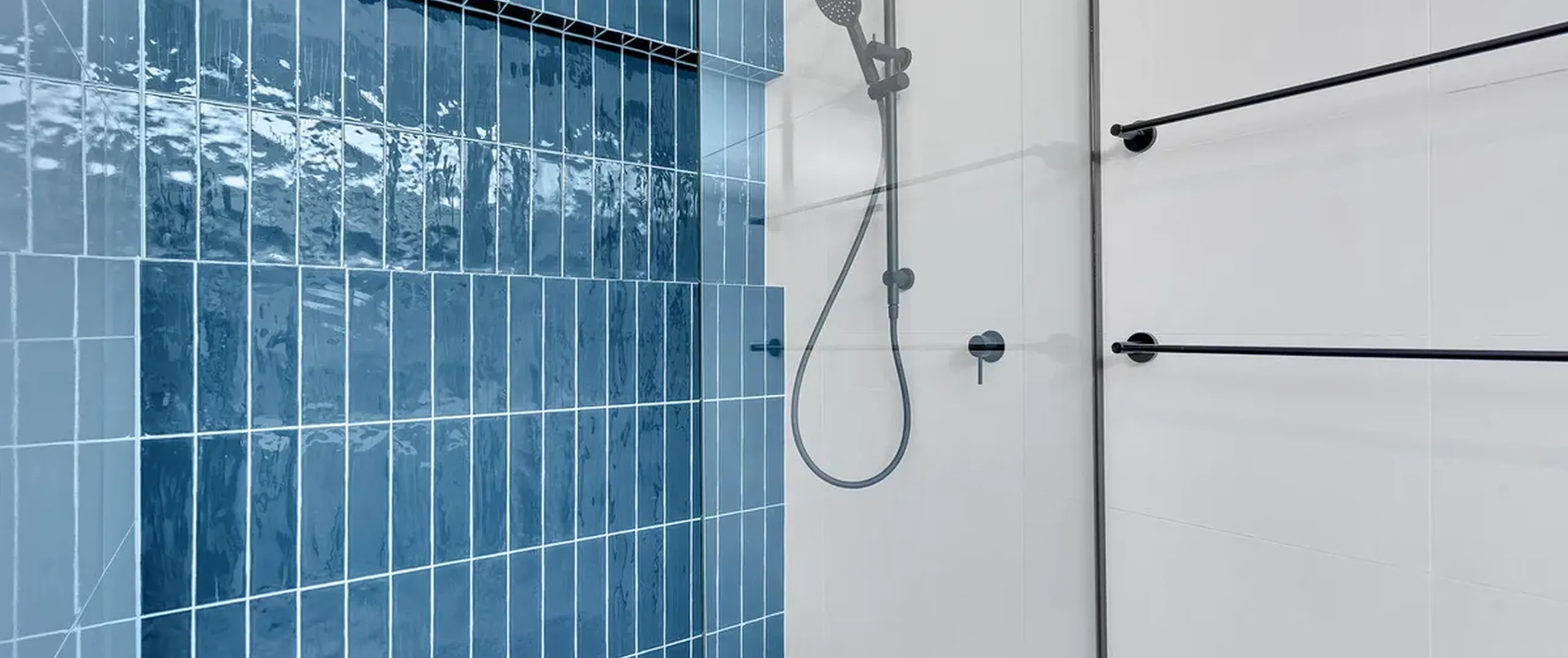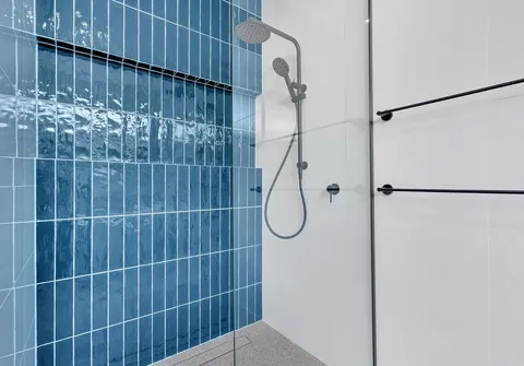 - Main bathroom with freestanding bath, large shower, tiled floor to ceiling