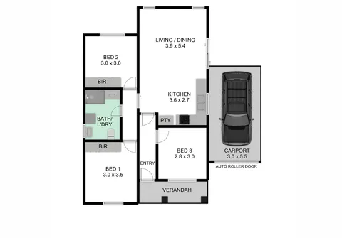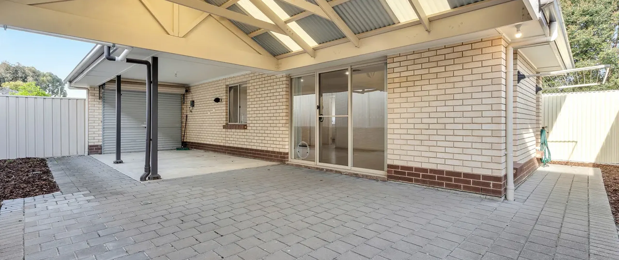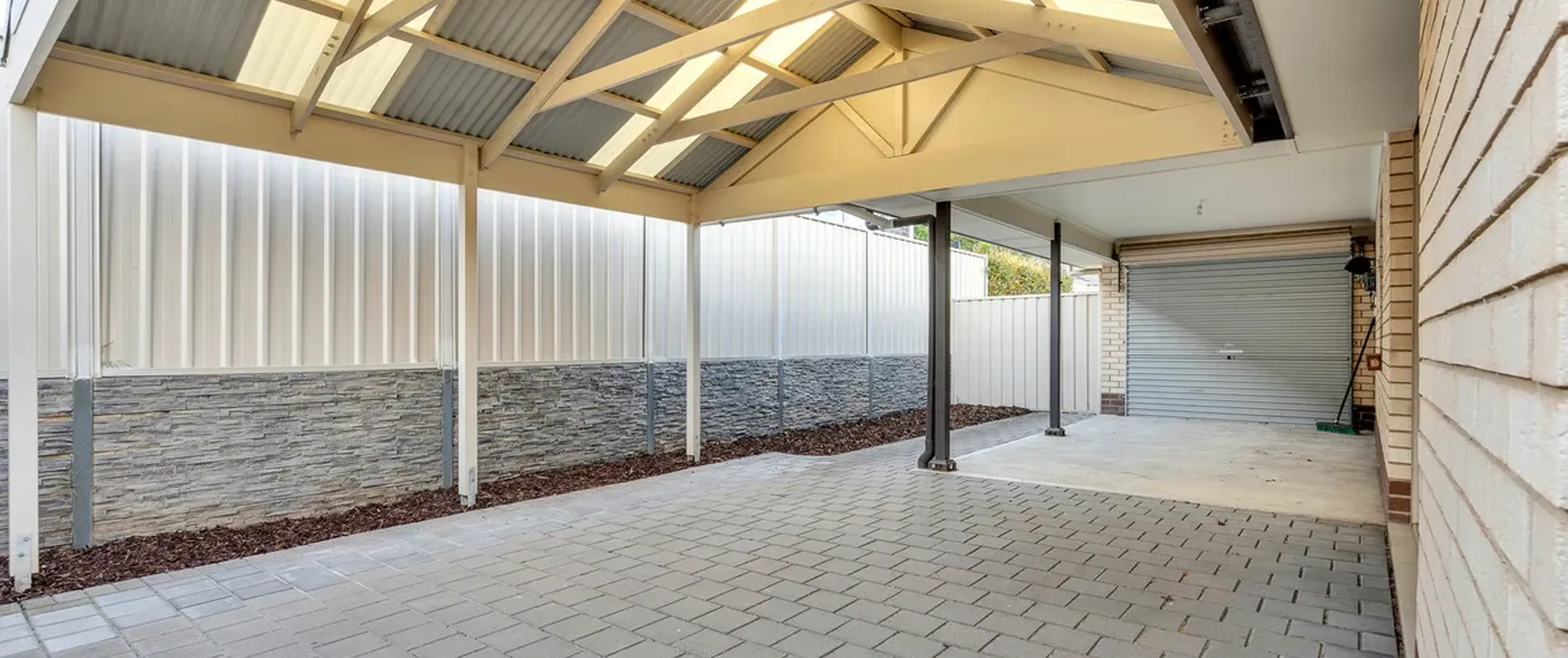 - Single car carport with automatic roller door and paved driveway for additional parking