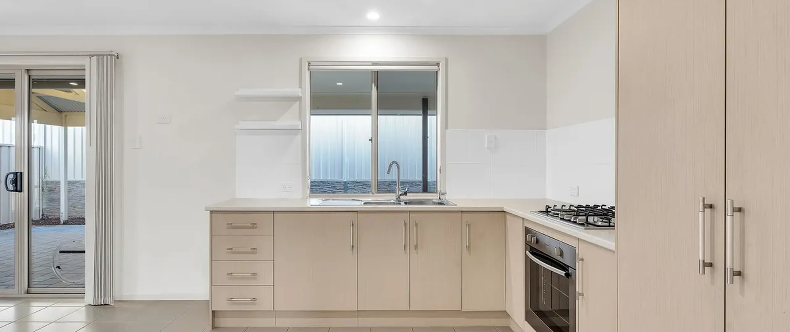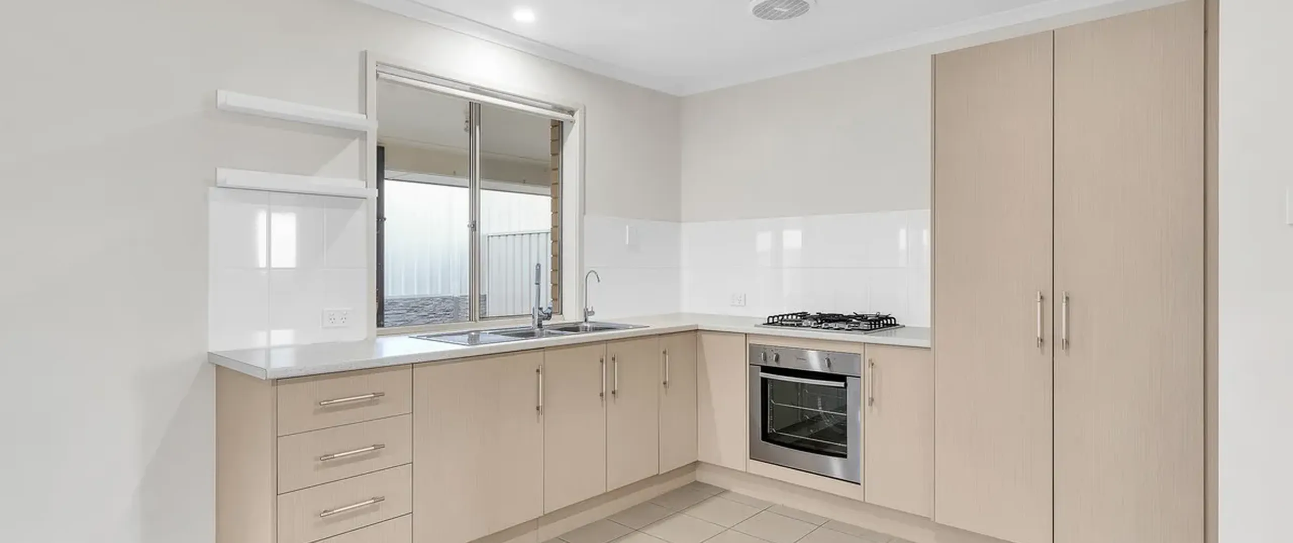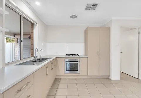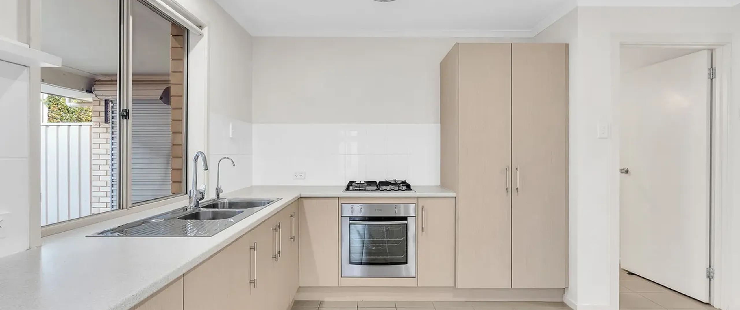 - Functional kitchen with gas cook top, electric oven, double sink, ample bench and cupboard space with large pantry